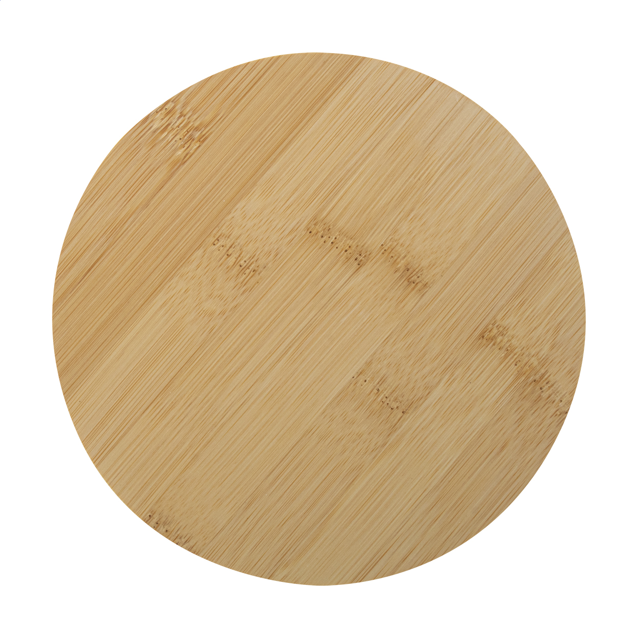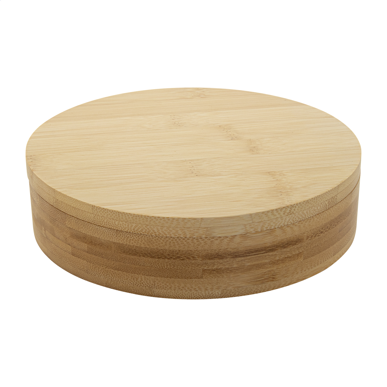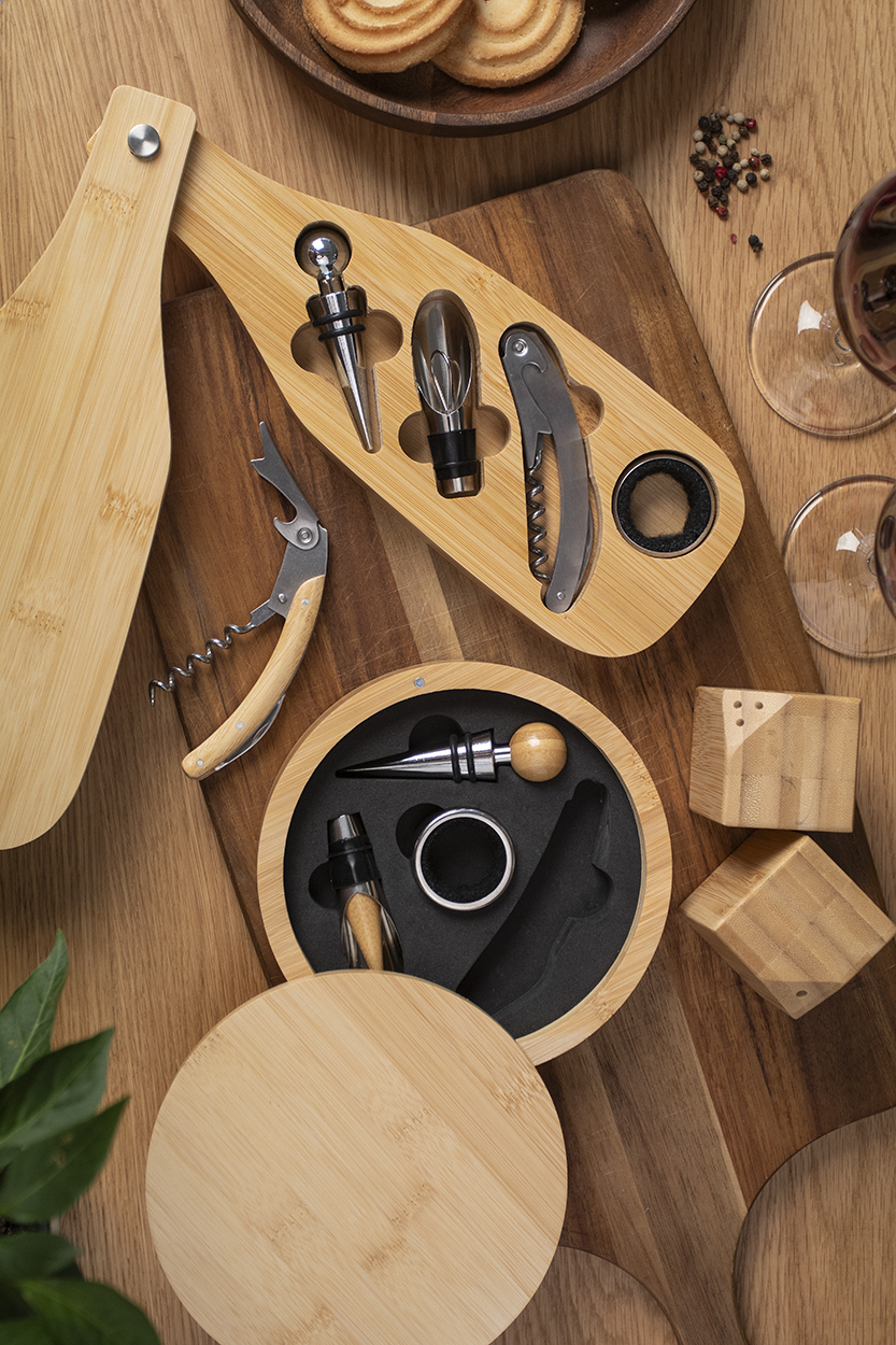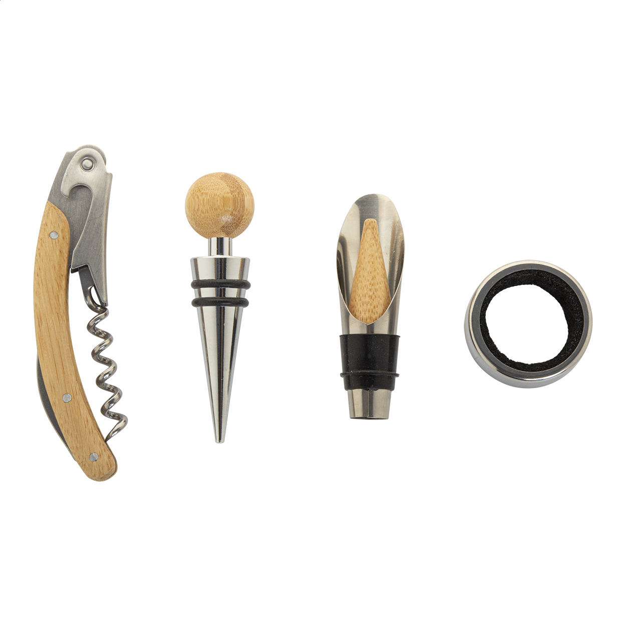 Set vino da 4 pz in acciaio inossidabile con inserti e contenitore rotondo in bambù. Il set si compone di cavatappi, salvagoccia, beccuccio e tappo.