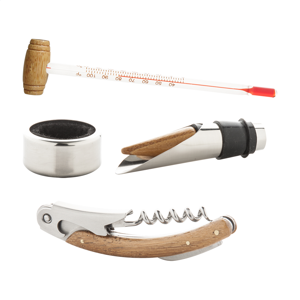 Set 4 accessori vino con particolari in legno, in scatola di bambù.