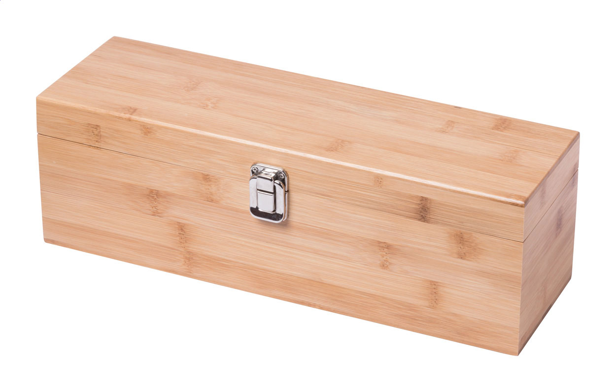 Set vino composto da un tappo, un cavatappi, un salva goccia ed un tappo versatore in scatola di bambù con scomparto per una bottiglia di vino, non inclusa.