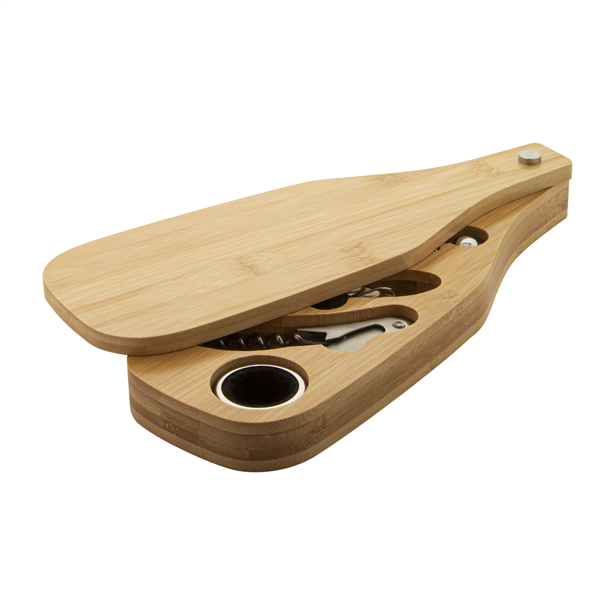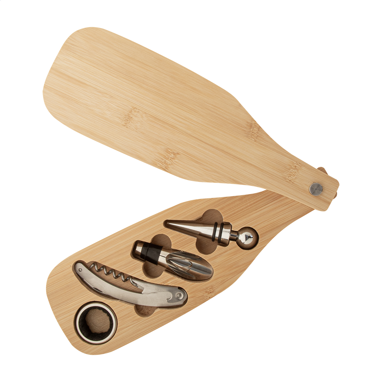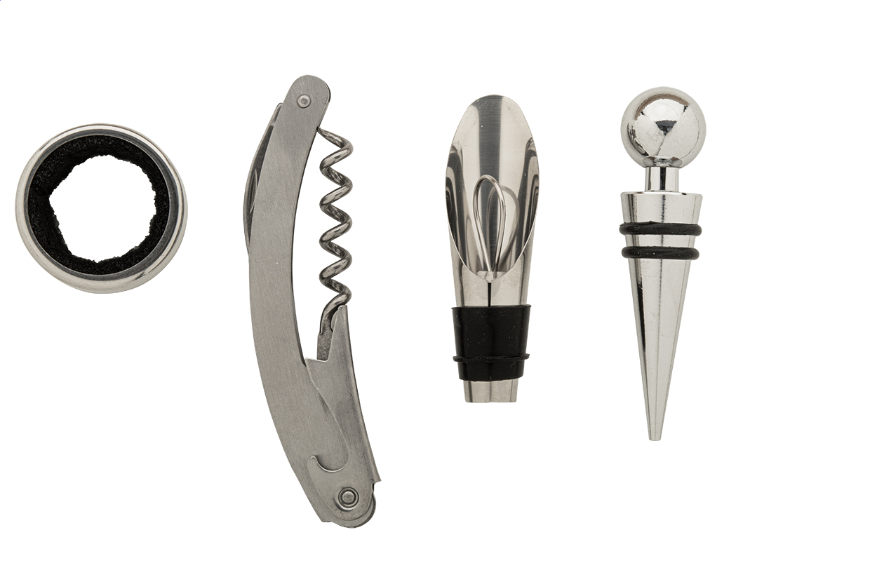 Set vino da 4 pz in acciaio inossidabile in scatola di bambù a forma di bottiglia. Il set si compone di cavatappi, salvagoccia, beccuccio e tappo.
