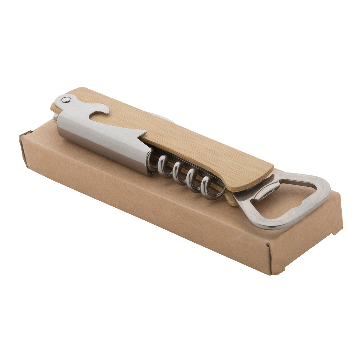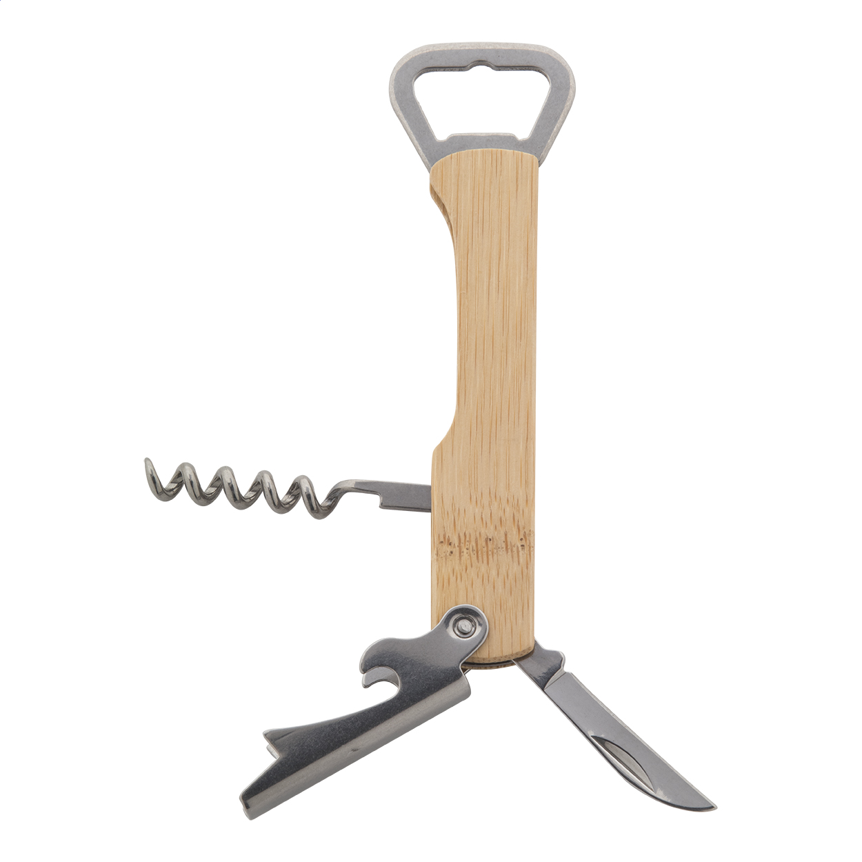 Apribottiglie e cavatappi in acciaio inox con manico in bambù.