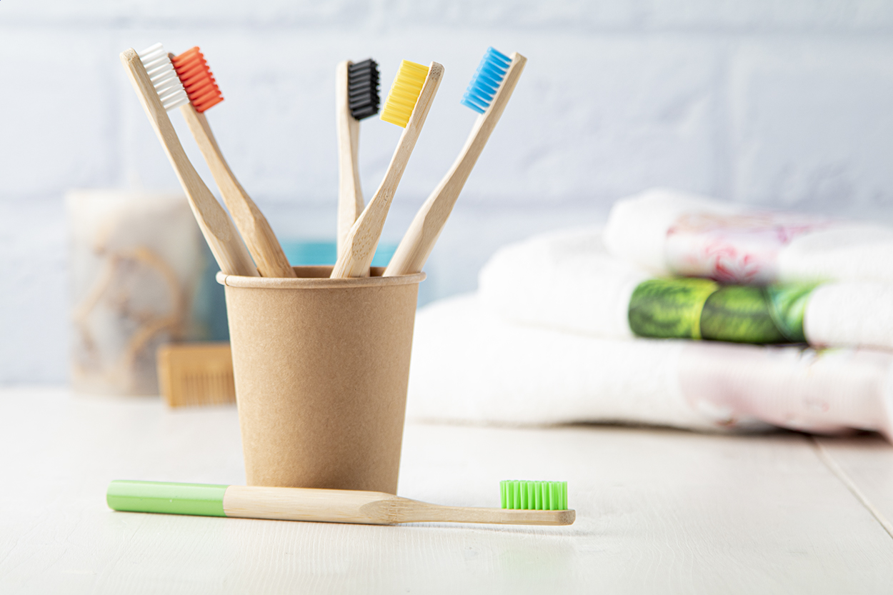 Spazzolino da denti per adulti con manico bambù naturale e setole di nylon colorate. Manico con decorazione coordinata al colore delle setole. Fornito in confezione di cartoncino.