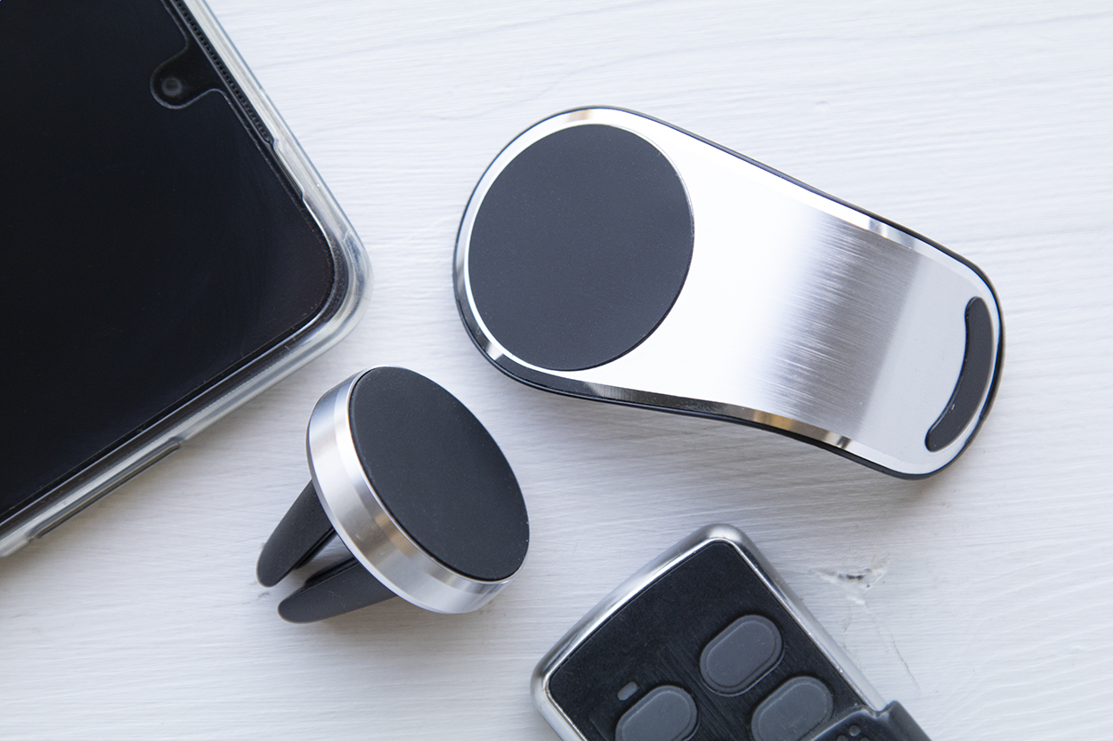 Supporto porta cellulare magnetico per auto in alluminio, con gancio di montaggio alle bocchette dell'aria. Piastra metallica autoadesiva compresa. In confezione regalo.