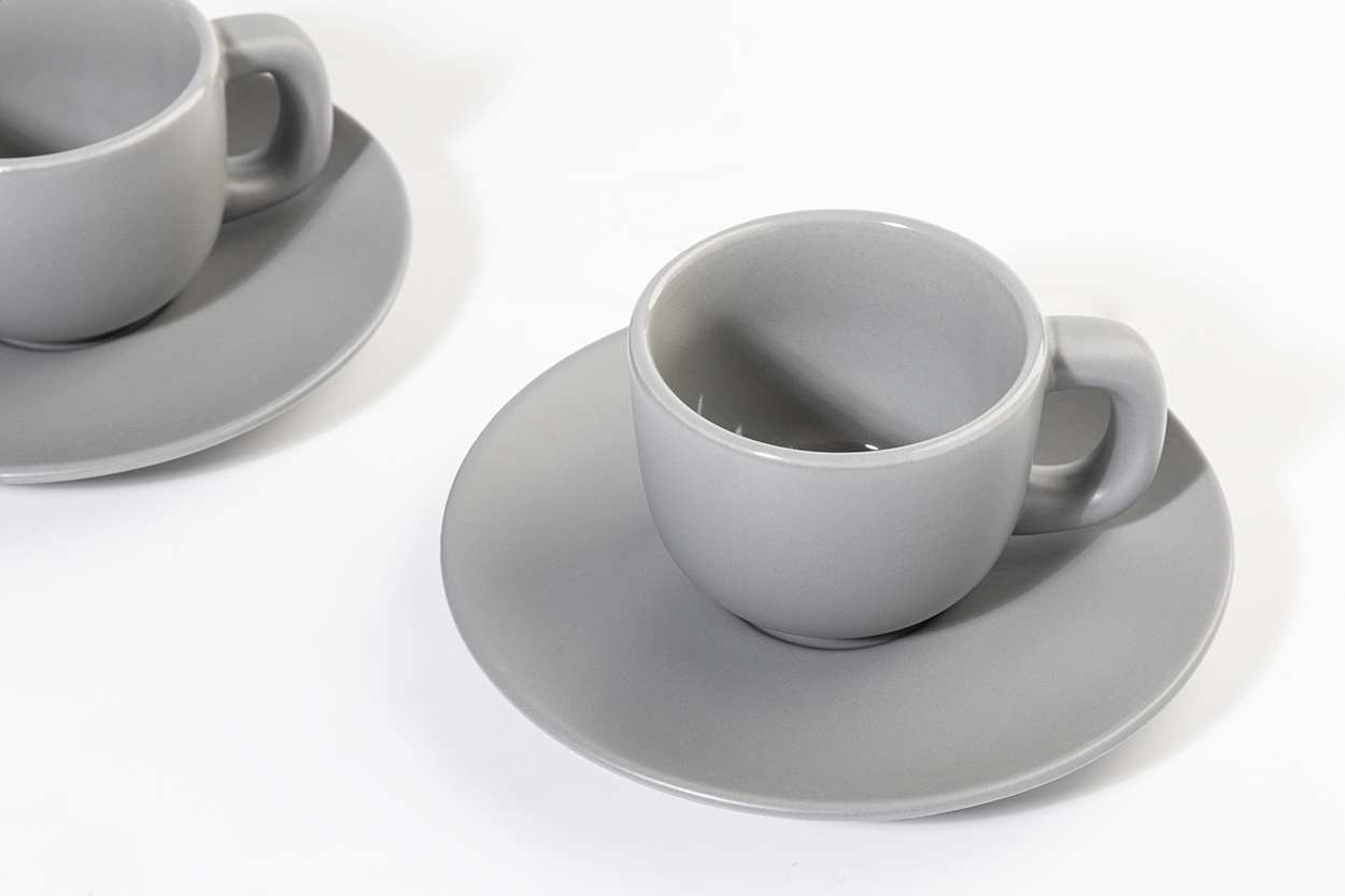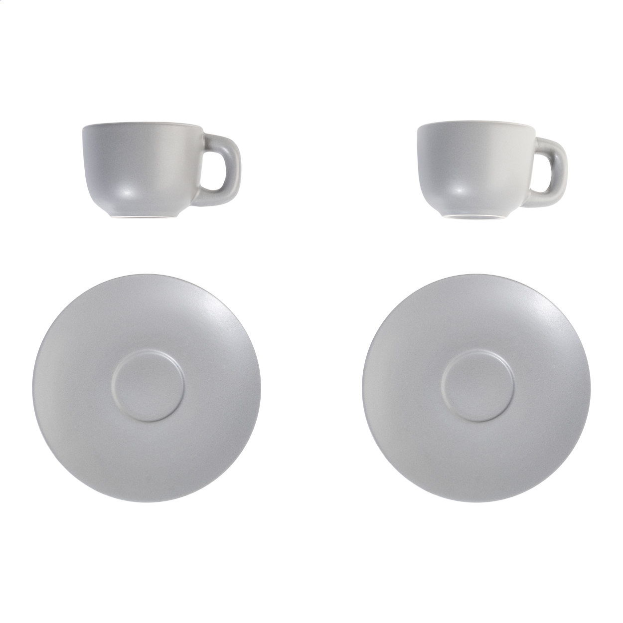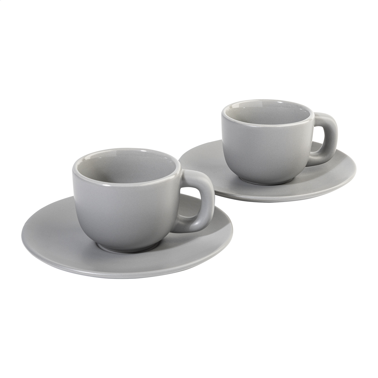 Set di tazze espresso da 85 ml. in ceramica di alta qualità composto da 2 tazze e da 2 piattini. Con finitura esterna opaca ed interno lucido. Confezione in scatola di cartoncino bianco.