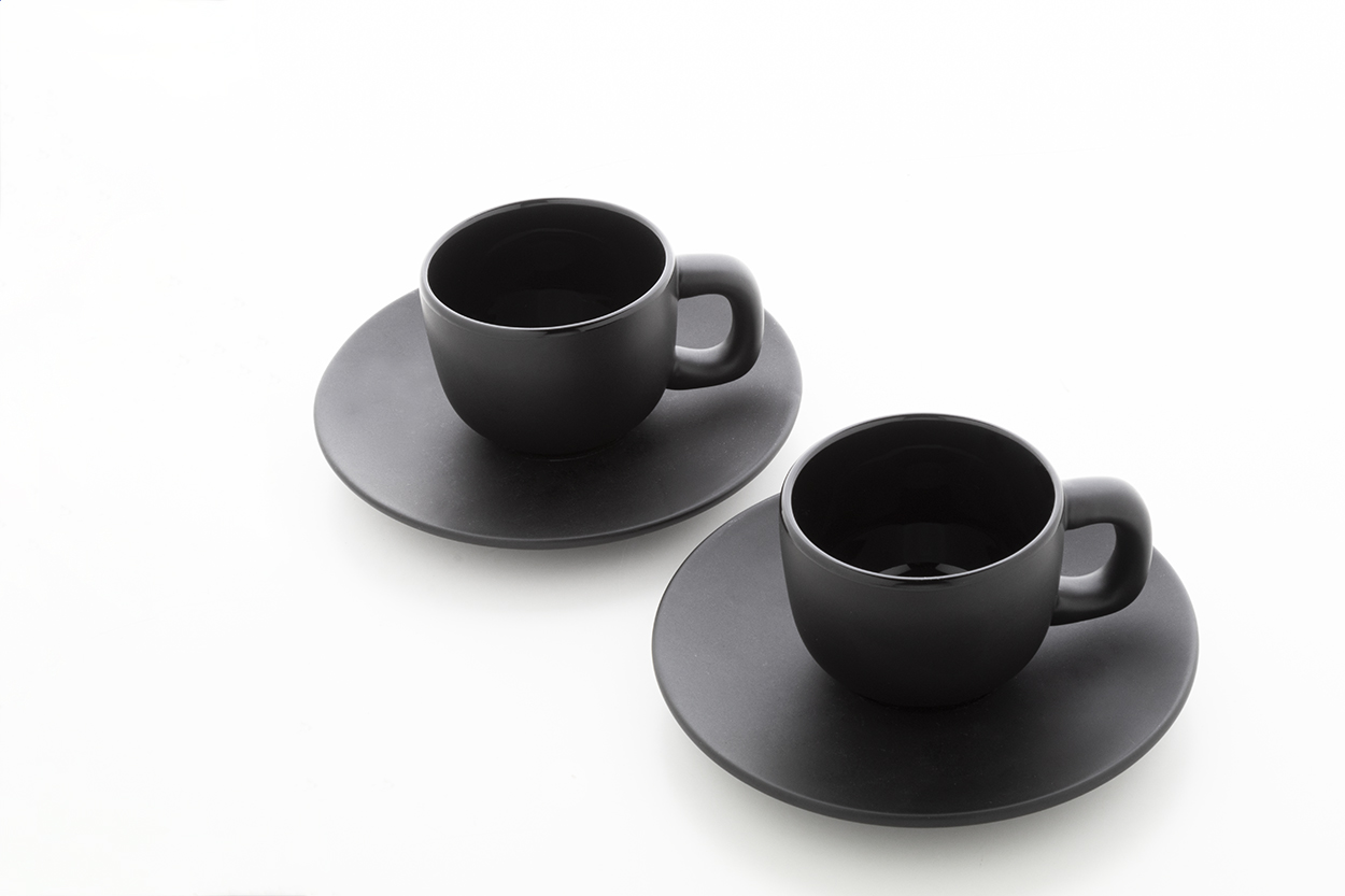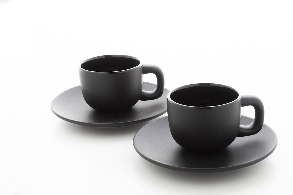 Set di tazze espresso da 85 ml. in ceramica di alta qualità composto da 2 tazze e da 2 piattini. Con finitura esterna opaca ed interno lucido. Confezione in scatola di cartoncino bianco.