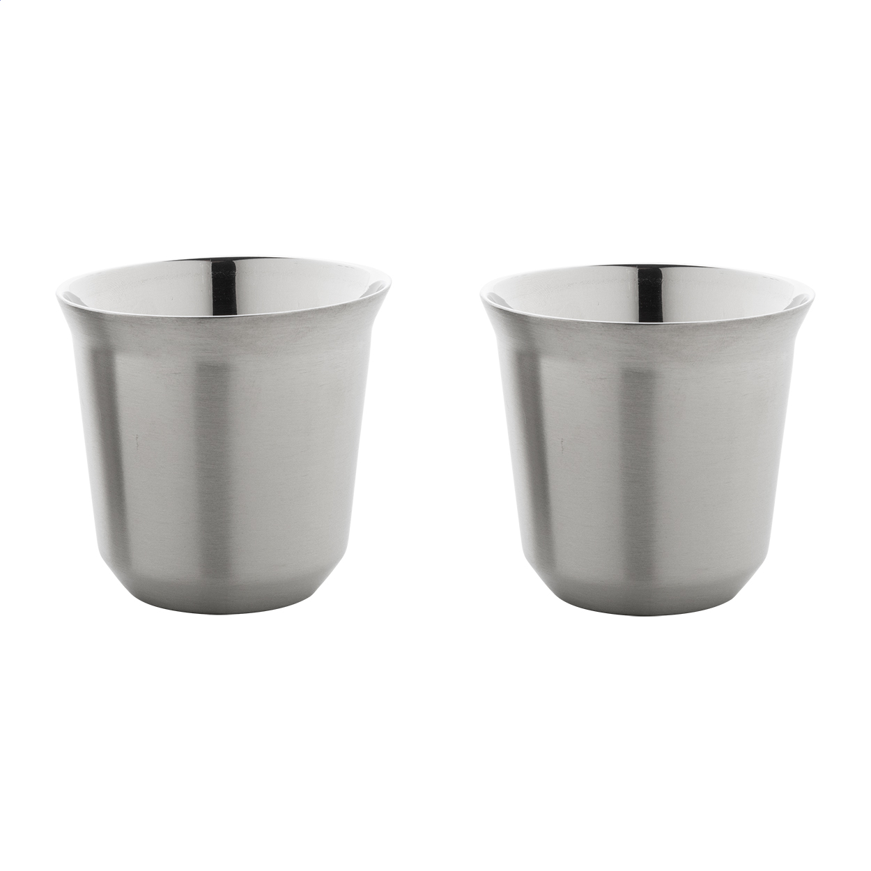 Set di 2 bicchierini per caffè espresso a doppia parete in acciaio riciclato da 80 ml. Set fornito in scatola di cartoncino kraft