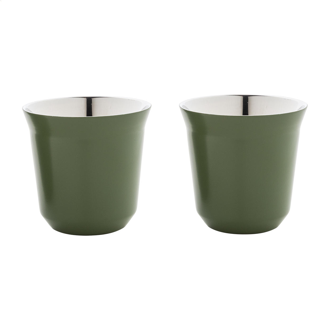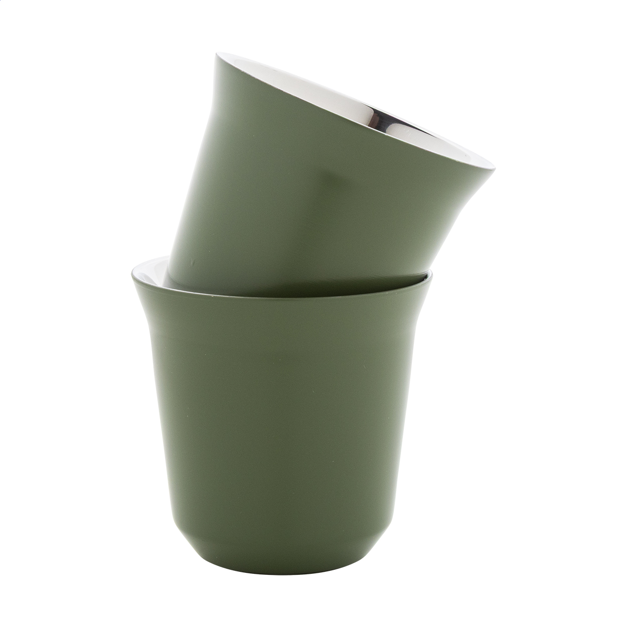 Set di 2 bicchierini per caffè espresso a doppia parete in acciaio riciclato da 80 ml. Set fornito in scatola di cartoncino kraft