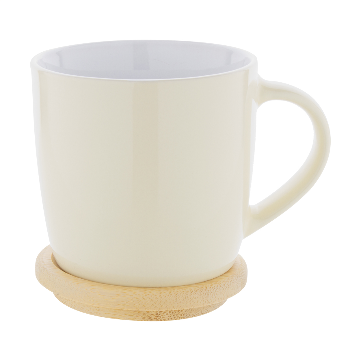 Tazza mug in ceramica colorata di alta qualità da 370 ml. con interno bianco, sottobicchiere in bambù e confezione di cartoncino kraft.