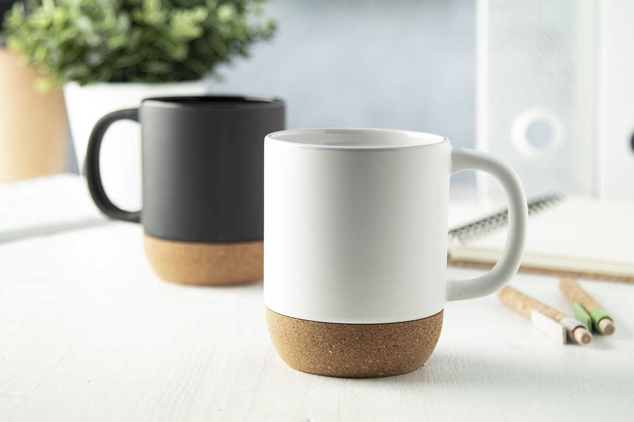 Tazza mug in ceramica da 420 ml. con base in sughero naturale. Fornita in confezione di cartoncino kraft.