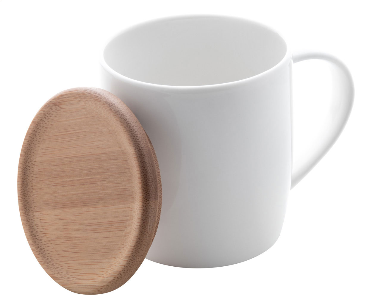 Tazza mug di porcellana di alta qualità 320 ml. in colore bianco con sottobicchiere di bambù. In confezione regalo.