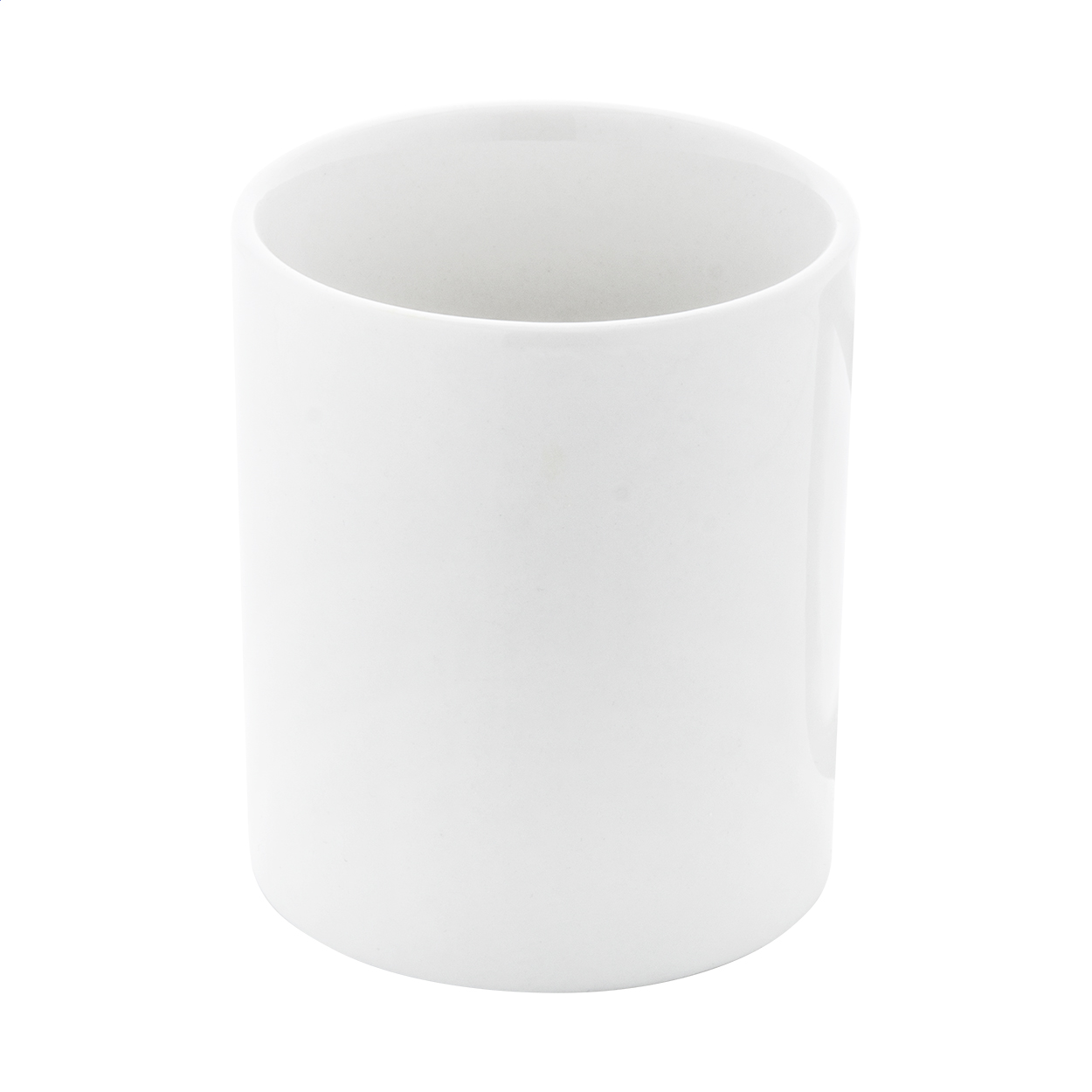 Tazza mug in ceramica bianca da 300ml. per stampa in sublimazione, lavabile in lavastoviglie. Confezione in scatola di cartoncino bianco.