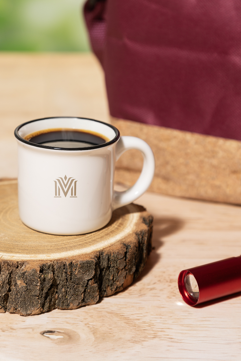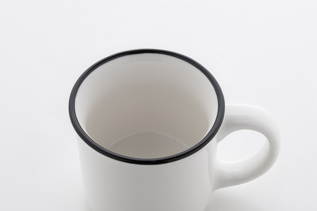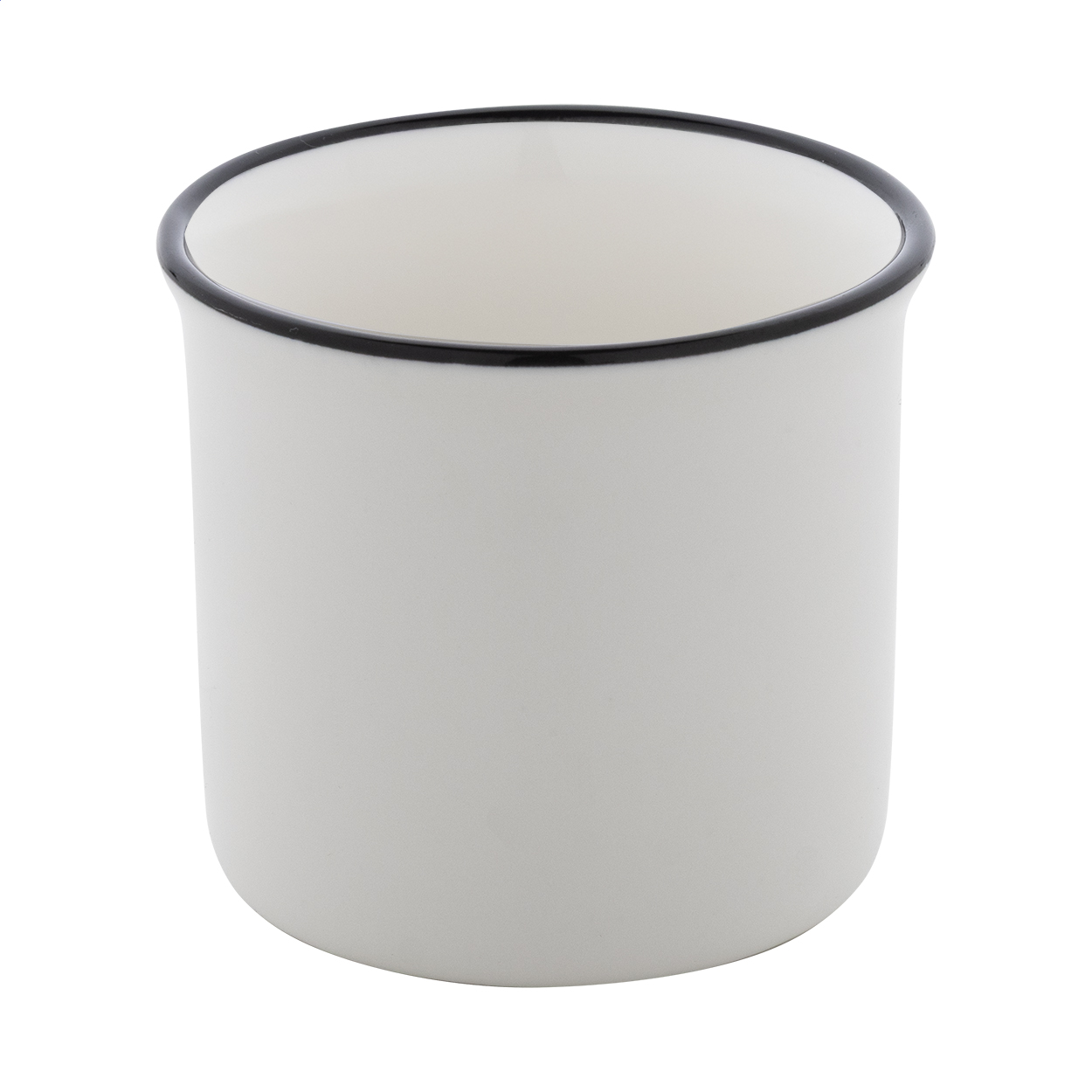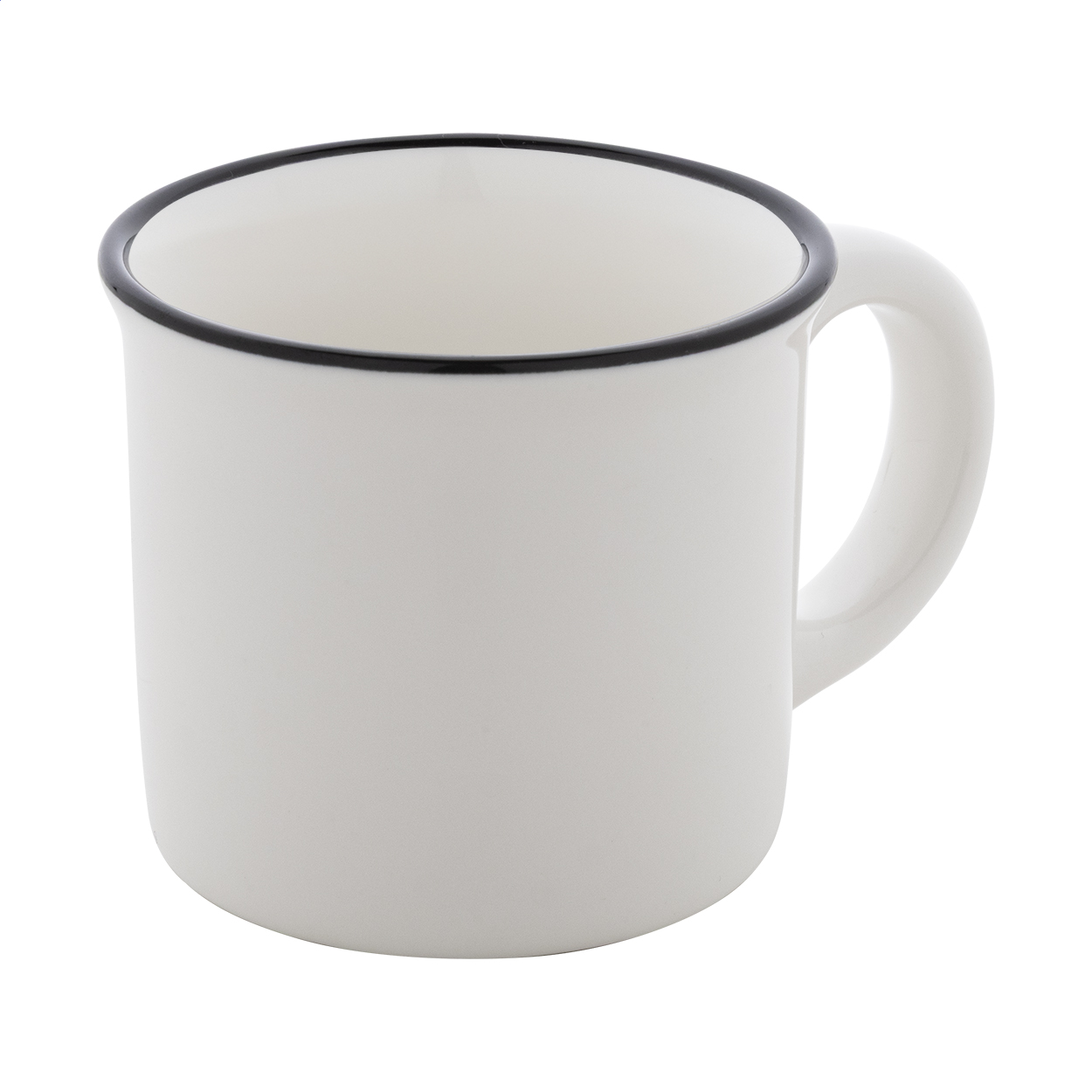 Mini tazza mug in ceramica 90 ml. in stile vintage con bordo nero, interno bianco ed esterno colorato. Fornita in scatola di cartoncino kraft.