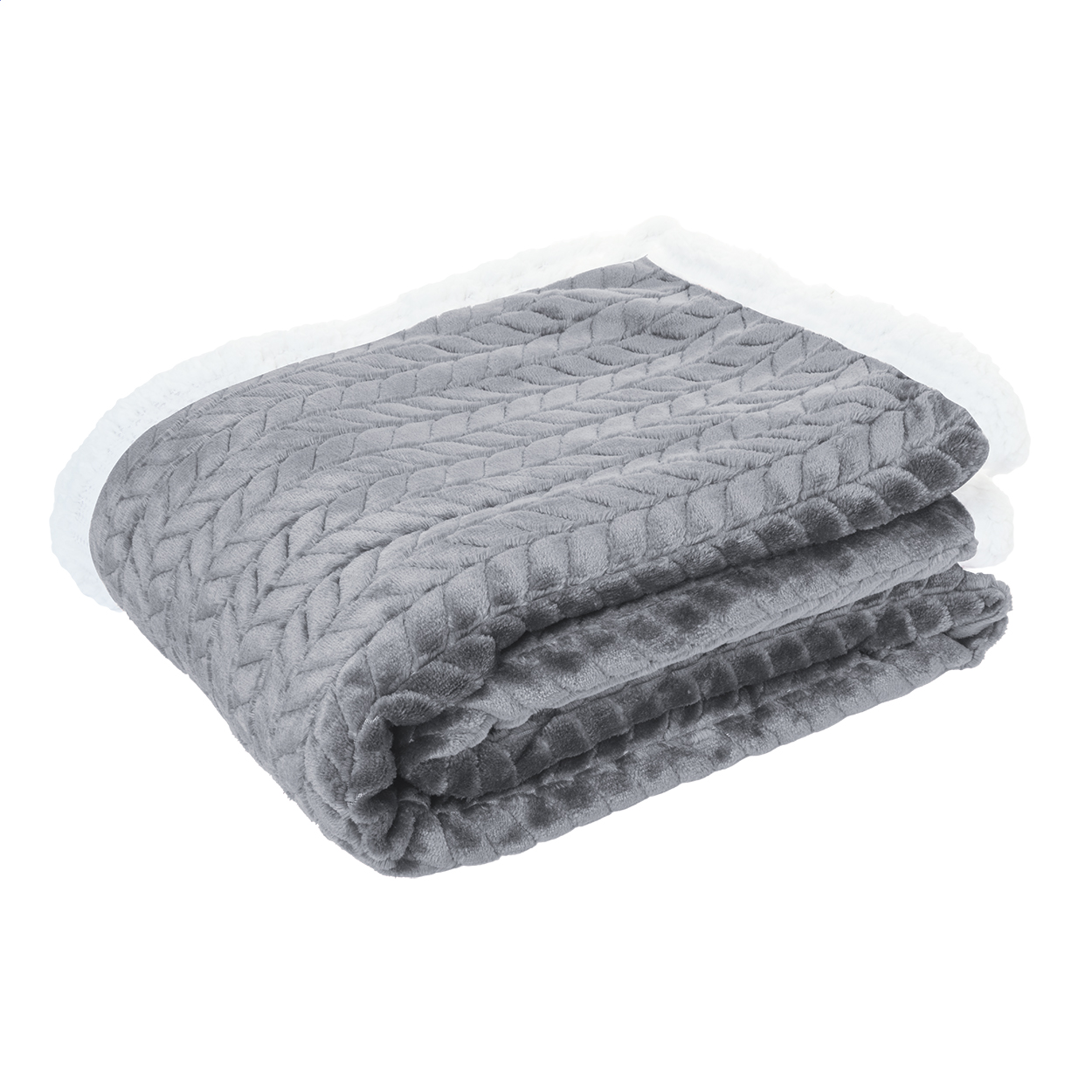 Coperta in RPET a doppio strato con motivo jacquard. Con pile di flanella RPET da 240 g/m² e fodera reversibile in pile sherpa RPET da 210 g/m². Confezionata con nastro e cartoncino stampabile.