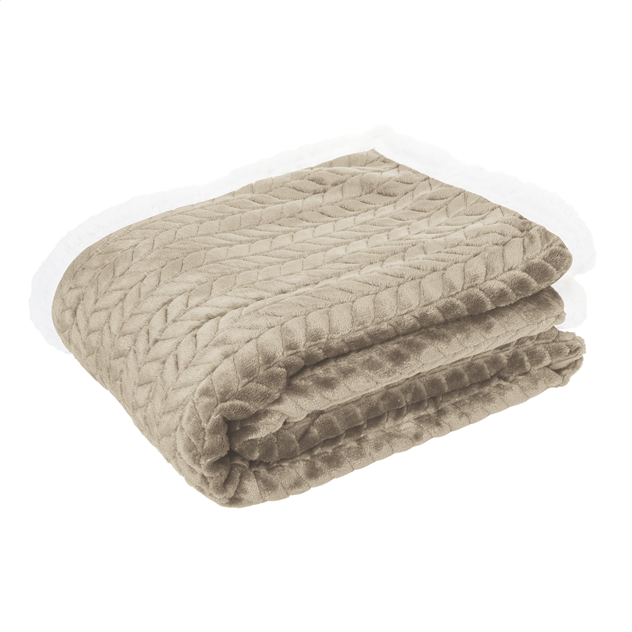 Coperta in RPET a doppio strato con motivo jacquard. Con pile di flanella RPET da 240 g/m² e fodera reversibile in pile sherpa RPET da 210 g/m². Confezionata con nastro e cartoncino stampabile.