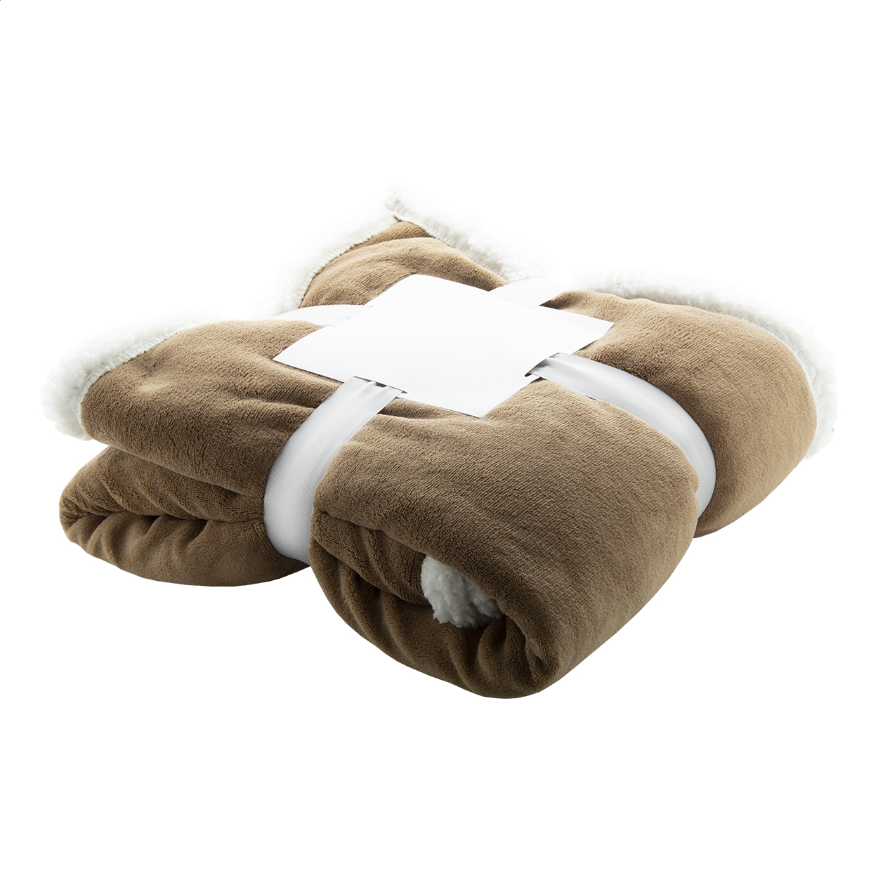 Coperta a doppio strato da 200 g/m² in pile coral e fodera reversibile in pile sherpa da 210 g/m². Confezionato con nastro e cartoncino stampabile.