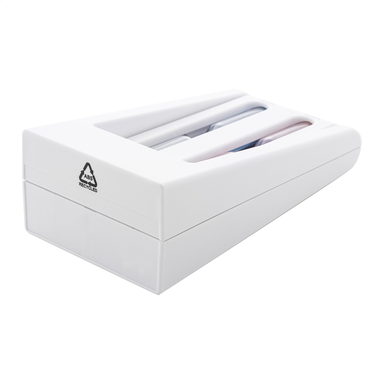 Supporto rotante in ABS riciclato con clessidre da 3 e 5 minuti.