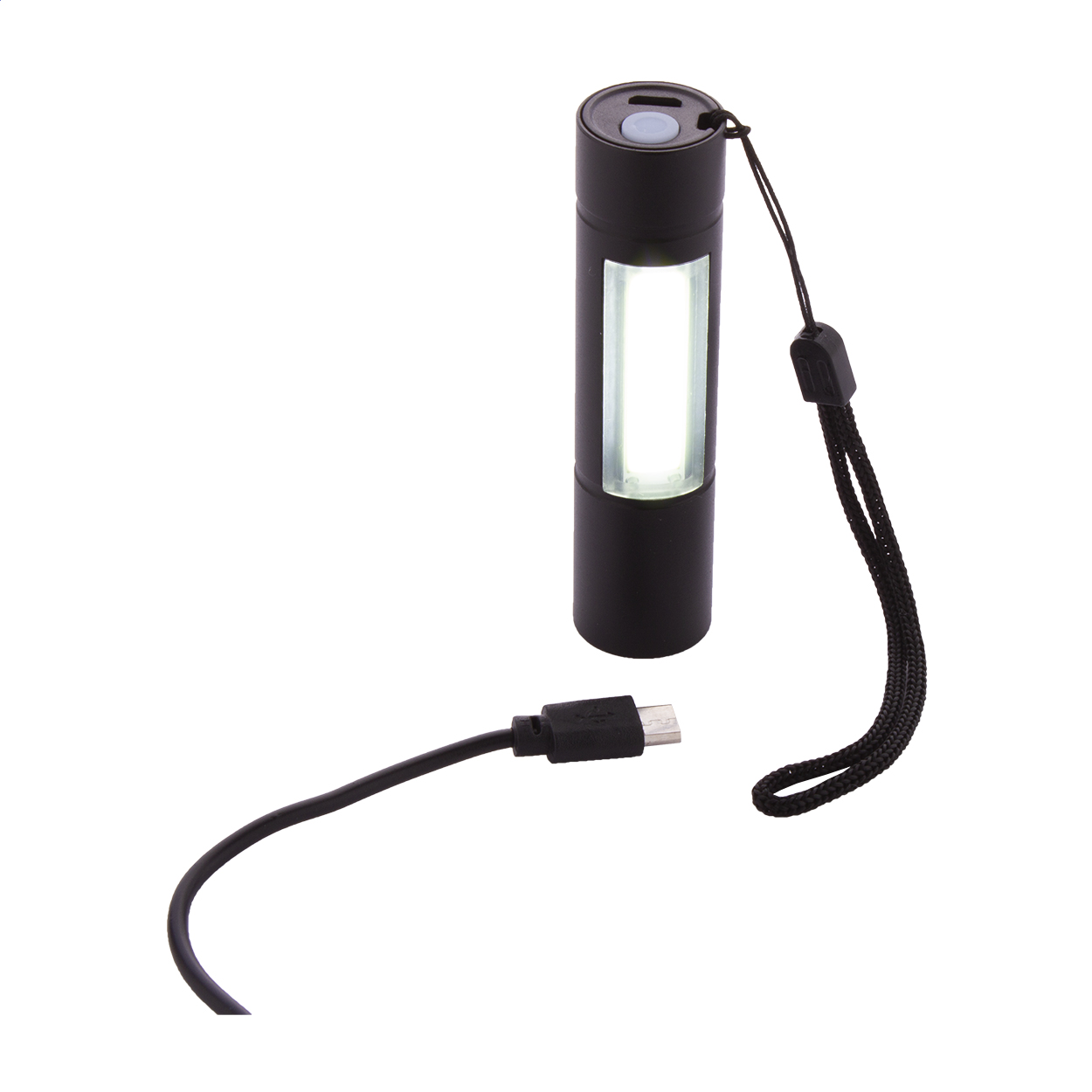Torcia in alluminio con batteria ricaricabile USB integrata (400 mAh). Dotata di luce frontale COB ad alta potenza ed ulteriore sorgente luminosa COB sul lato. Modalità di luce fissa e lampeggiante. Fornita con cavo di ricarica USB.