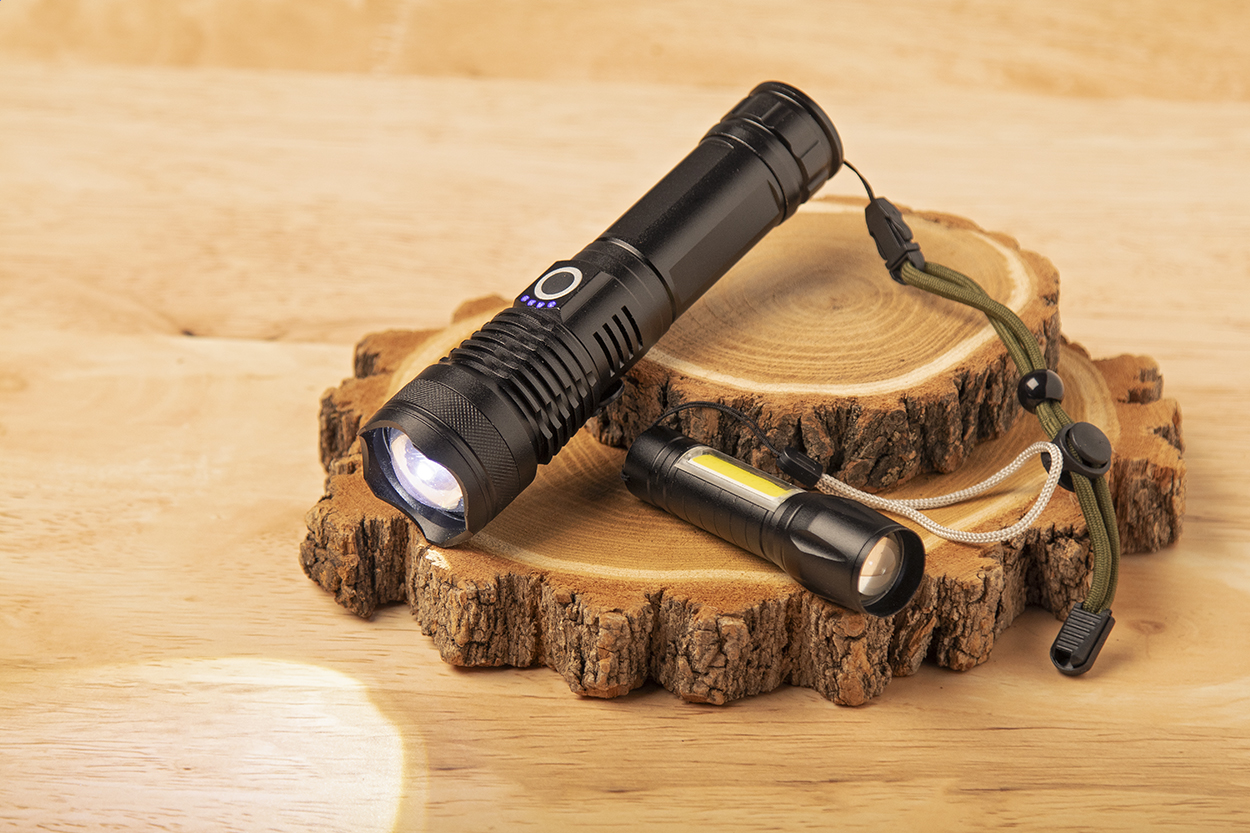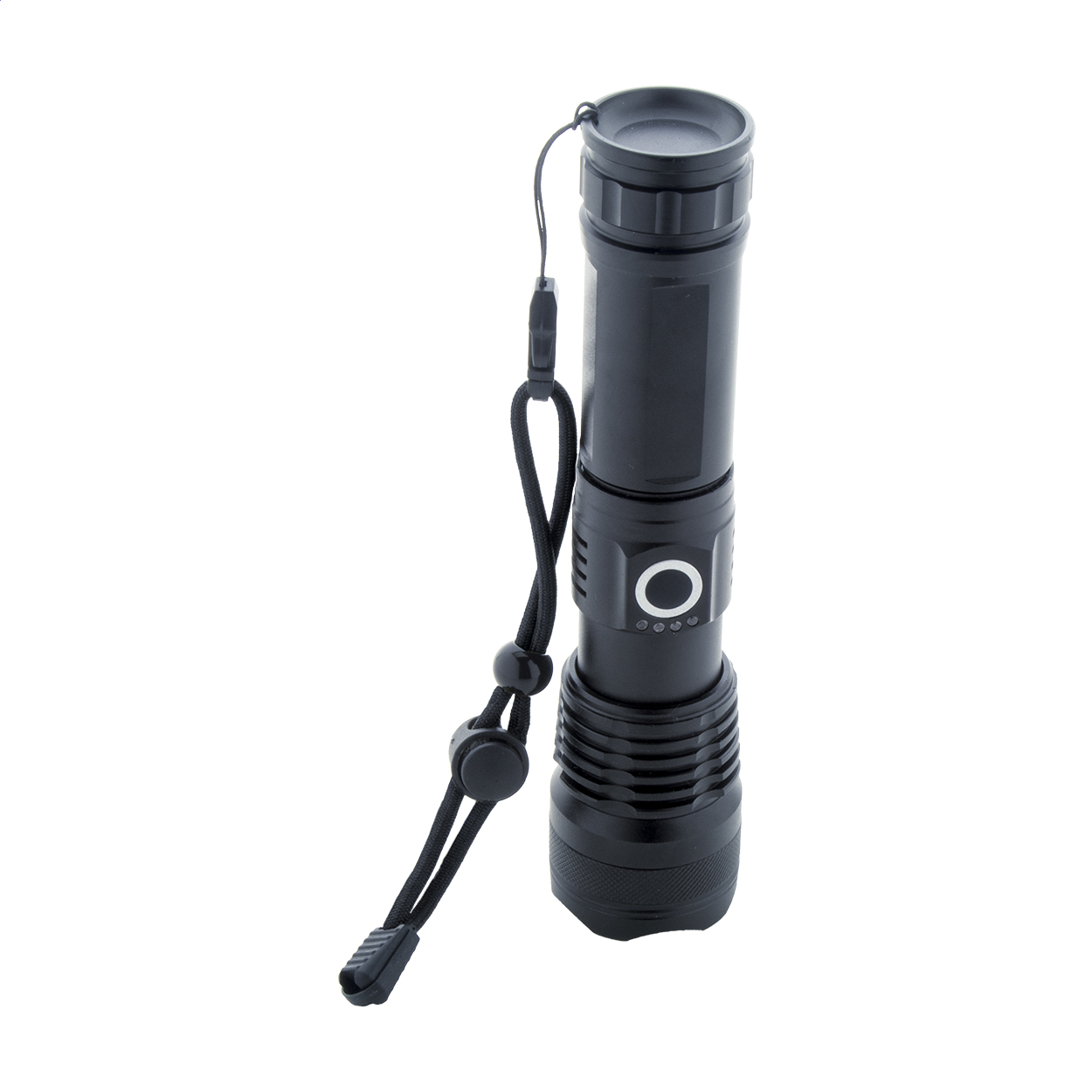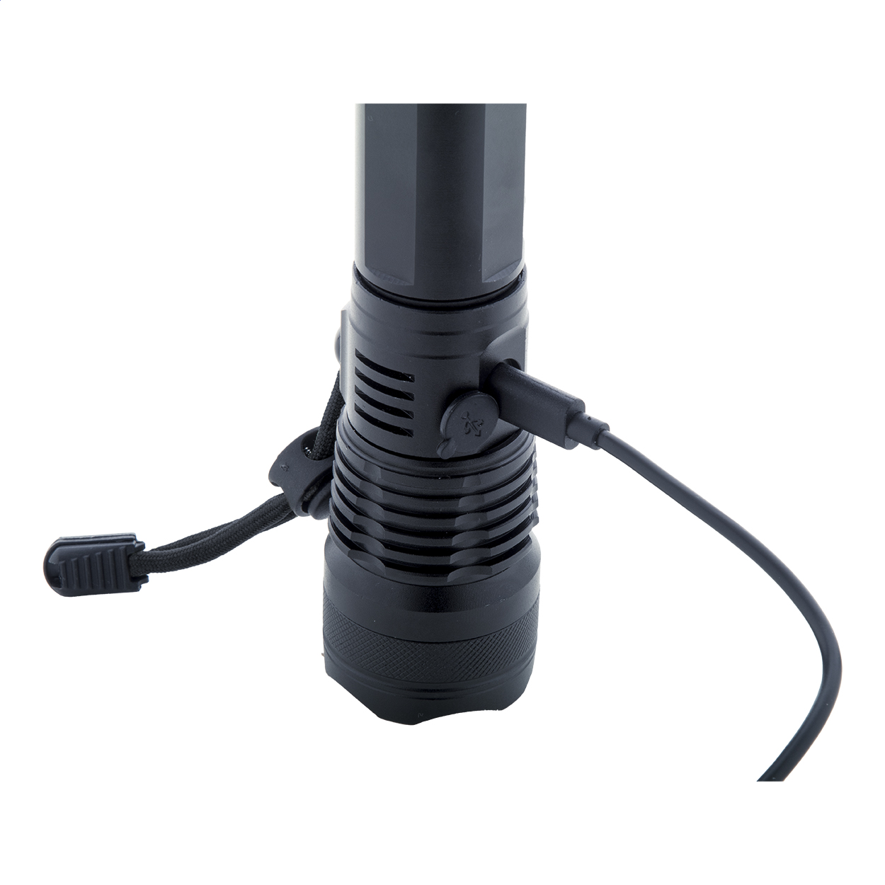 Torcia in alluminio con batteria ricaricabile USB integrata (1500 mAh) e cinturino per il trasporto. Dispone di luce COB ad alta potenza zoomabile. Modalità di luce intensa, media, bassa e lampeggiante. Fornita con cavo di ricarica USB.