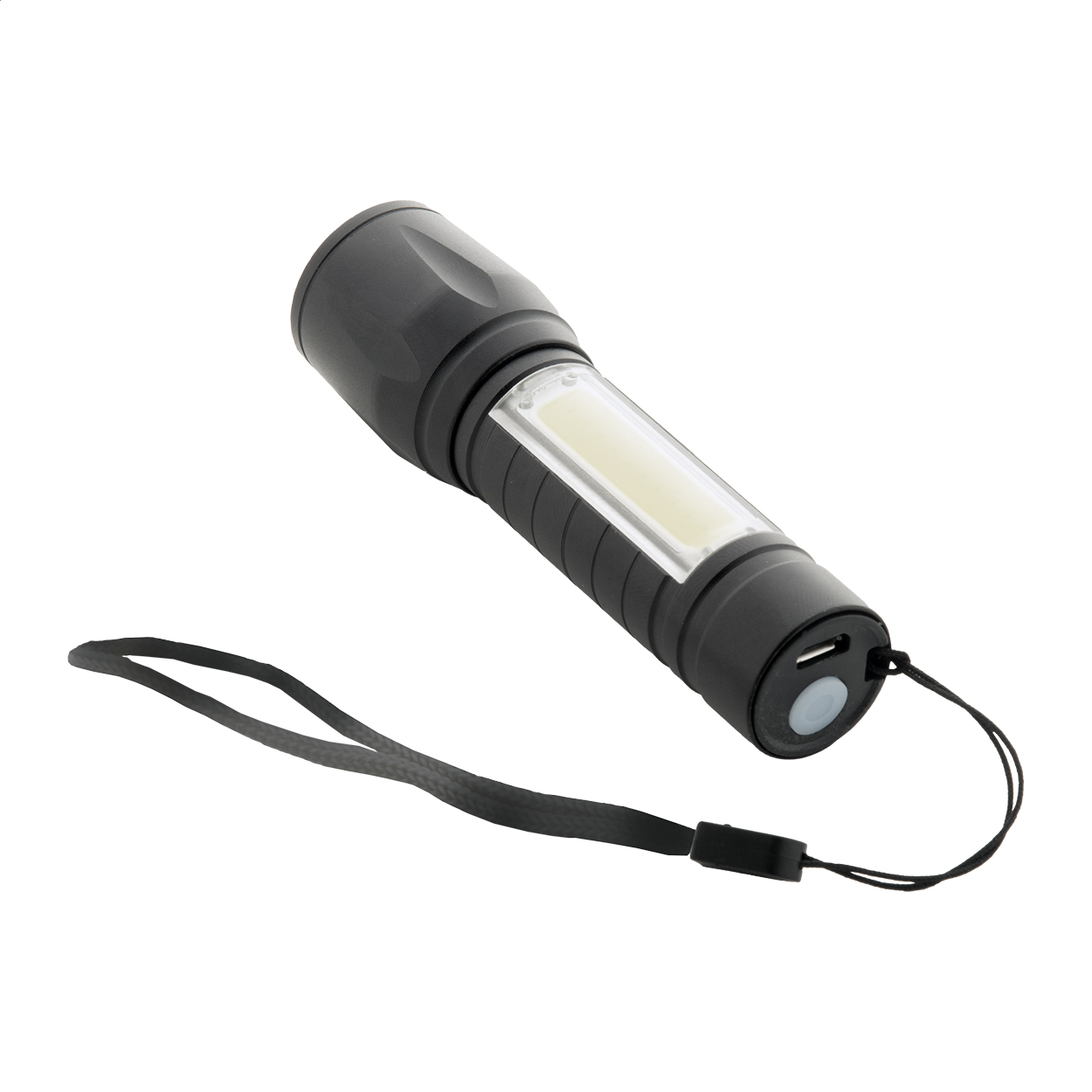 Torcia in alluminio con batteria ricaricabile USB integrata (400 mAh) e laccetto per il trasporto. Dotata di luce COB ad alta potenza zoomabile e sorgente luminosa COB sul lato. Modalità di luce fissa e lampeggiante. Fornita con cavo di ricarica USB.