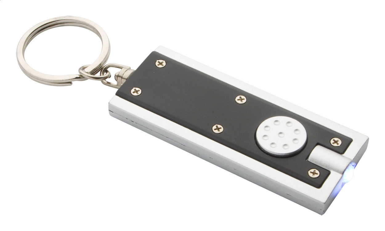 Portachiavi in plastica con torcia LED e portachiavi in metallo. Con 3 batterie a bottone.