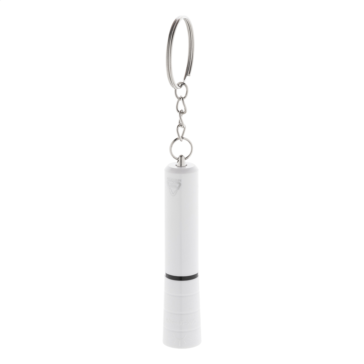 Mini torcia in plastica ABS riciclata con 1 LED, finitura metallica e portachiavi in metallo. Fornita con batteria a bottone.