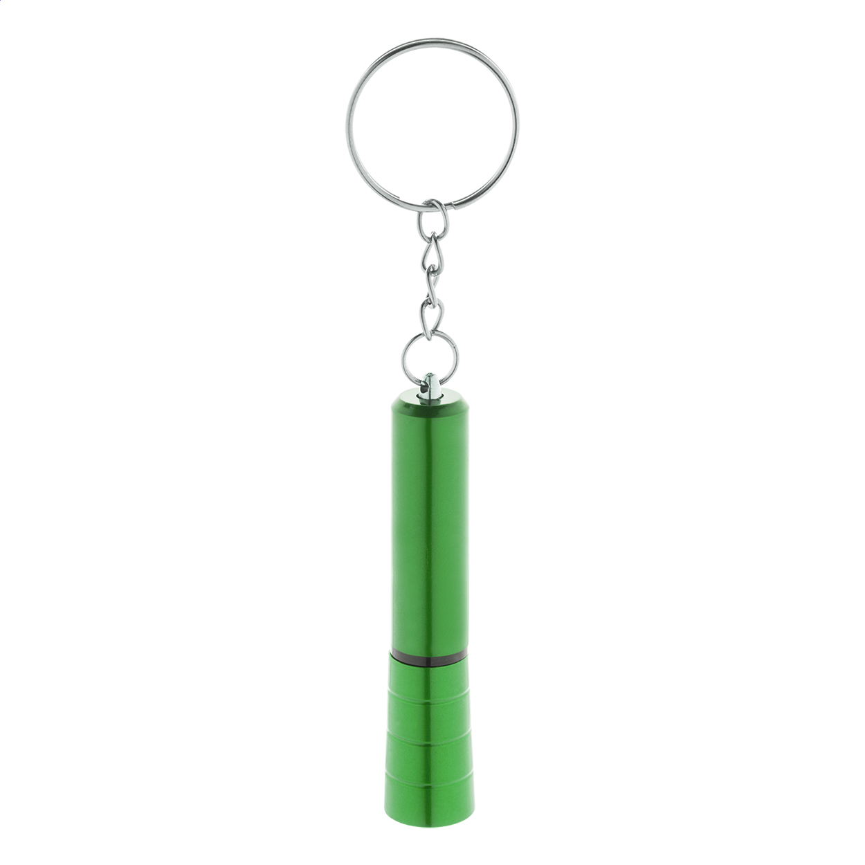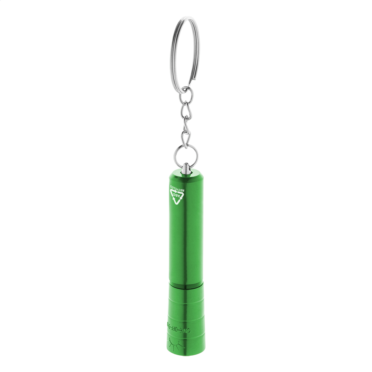 Mini torcia in plastica ABS riciclata con 1 LED, finitura metallica e portachiavi in metallo. Fornita con batteria a bottone.