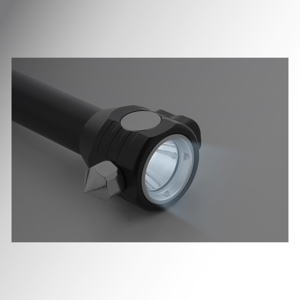 Torcia in alluminio 3in1 con martello di emergenza e taglia cinture di sicurezza. Completa di batteria ricaricabile USB integrata (500 mAh), magnete, cinturino, luce COB ad alta potenza sul fronte e illuminatore COB sul lato. Cavo di ricarica USB incluso.