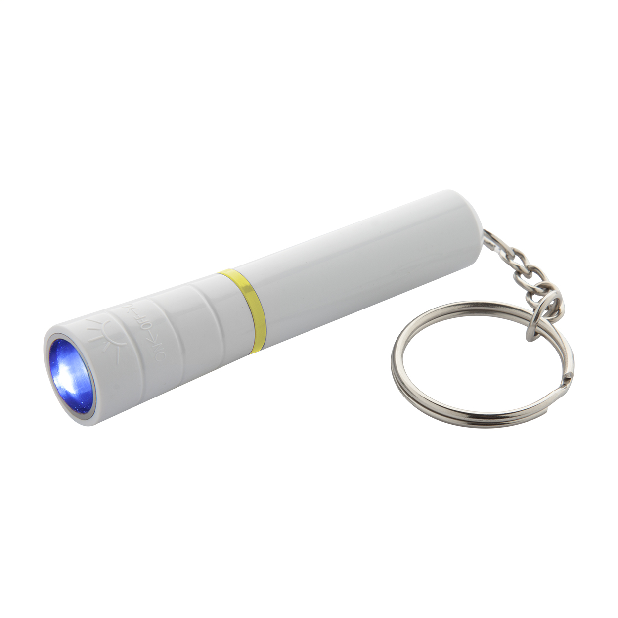 Mini torcia in plastica con 1 LED e portachiavi in metallo. Fornita di batteria a bottone.