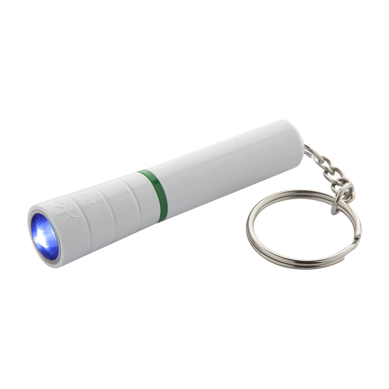 Mini torcia in plastica con 1 LED e portachiavi in metallo. Fornita di batteria a bottone.