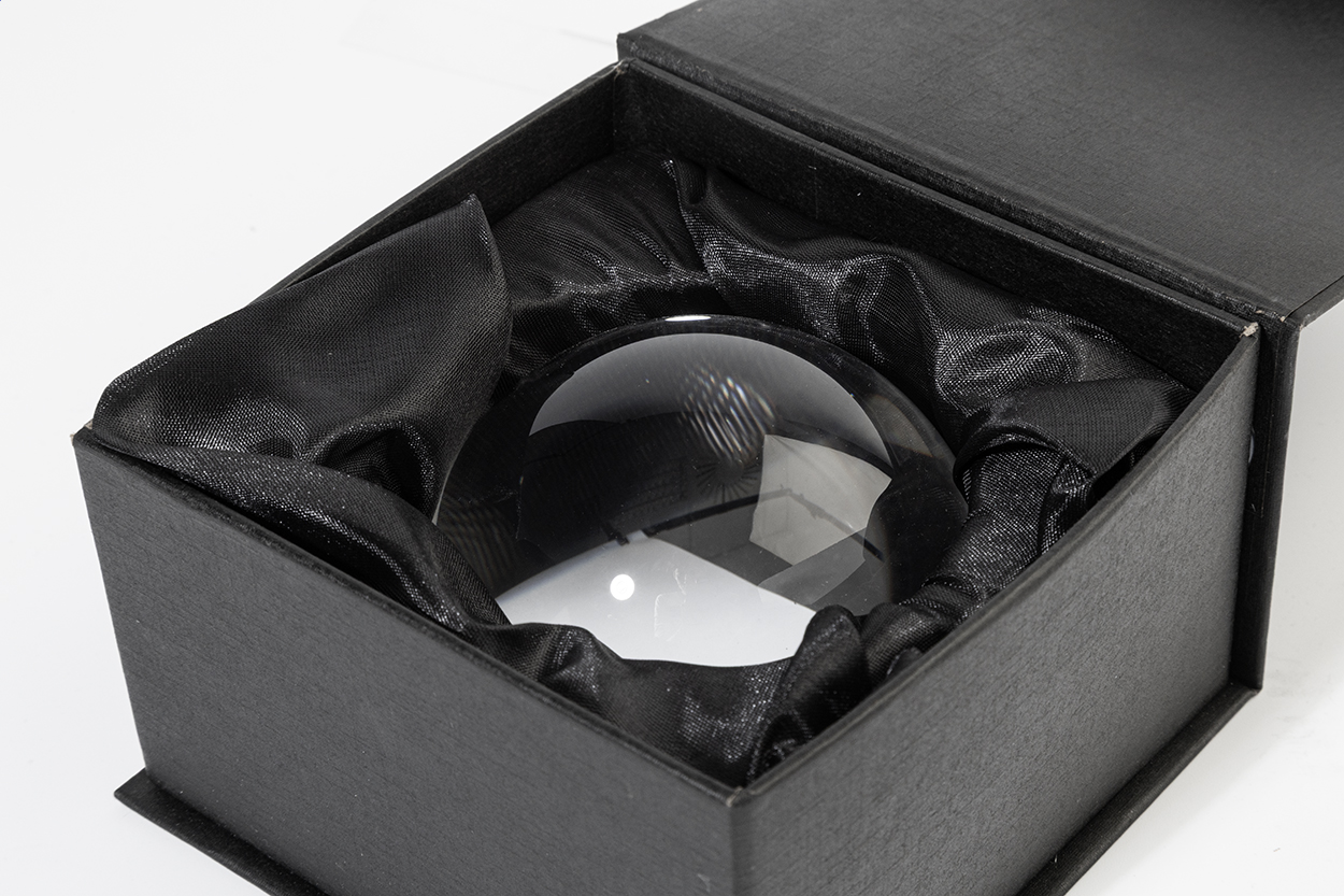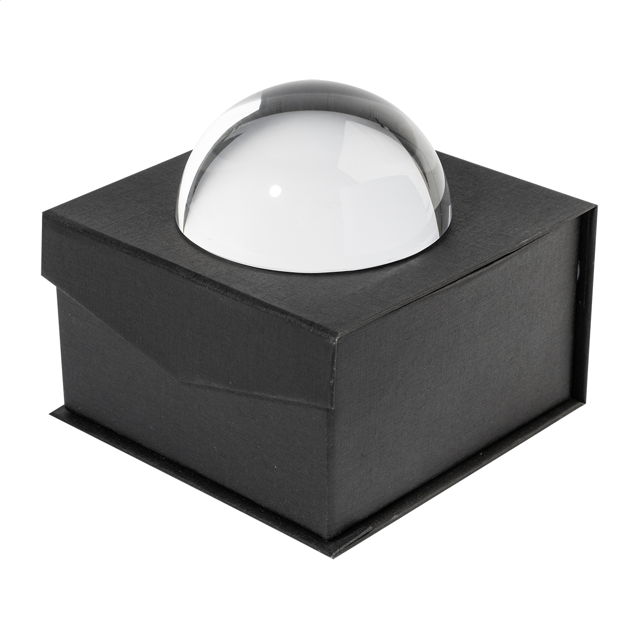 Fermacarte e lente d'ingrandimento a forma di cupola in vetro. In confezione regalo in cartoncino nero con inserto in velluto e chiusura magnetica.