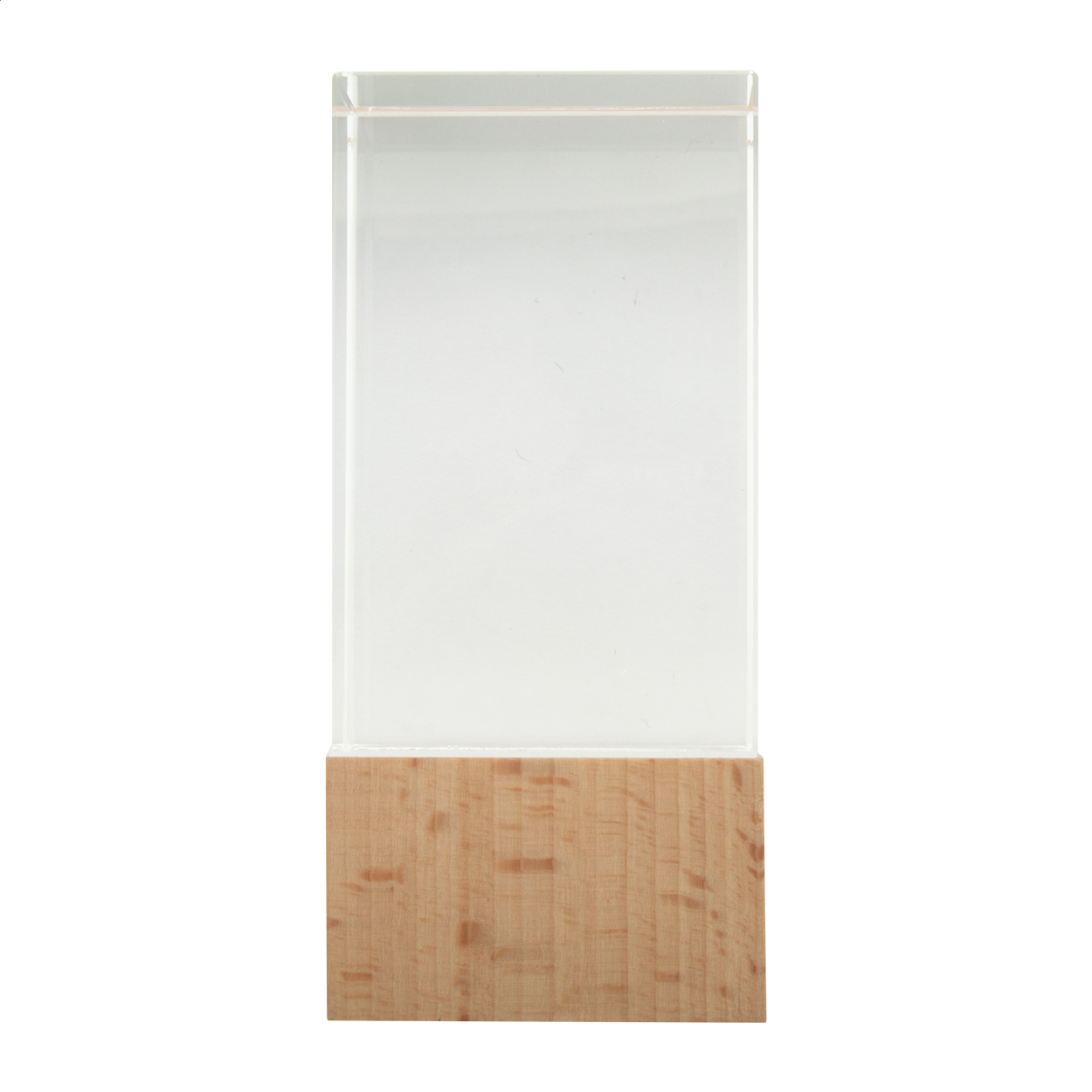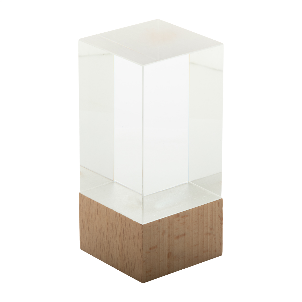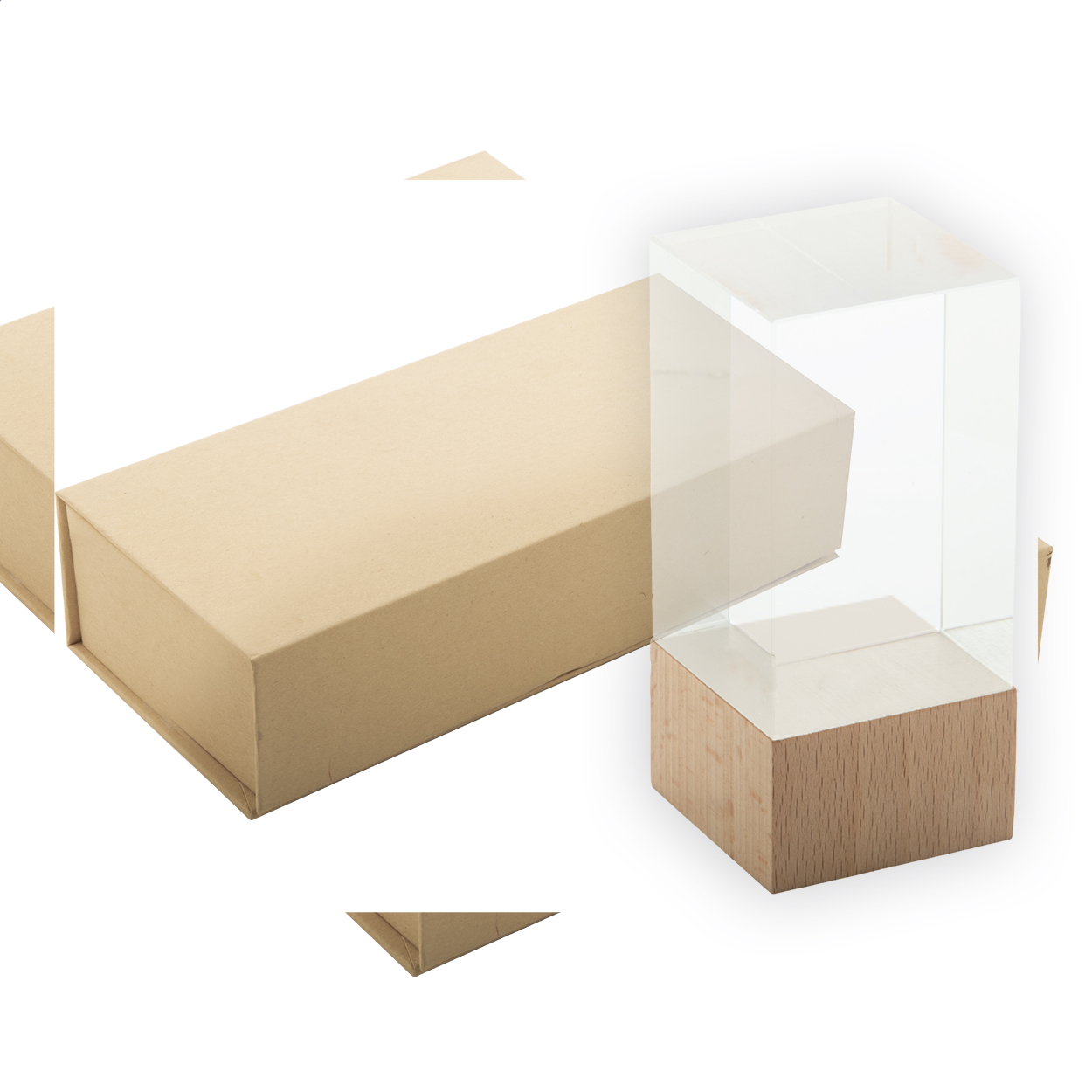 Trofeo in vetro con base in legno di faggio, completo di confezione regalo in cartoncino kraft.