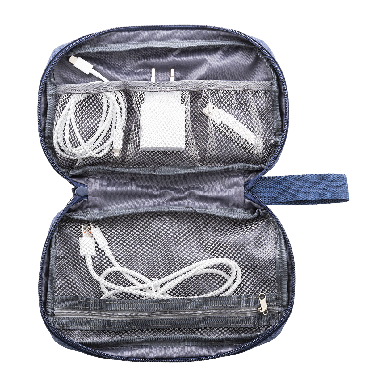Custodia organizer per cavetteria in poliestere 600D RPET, scomparti interni in rete, tasca frontale chiusa da cerniera ed etichetta RPET.