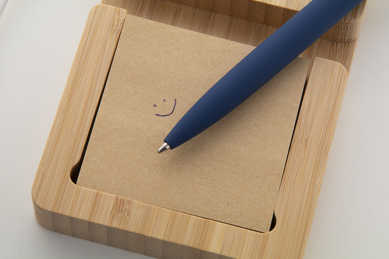 Hub USB2.0 in bambù con supporto per cellulare e 130 foglietti in carta kraft; dispone di 2 porte USB, 2 porte USB-C e cavo per connessioni USB e USB-C.