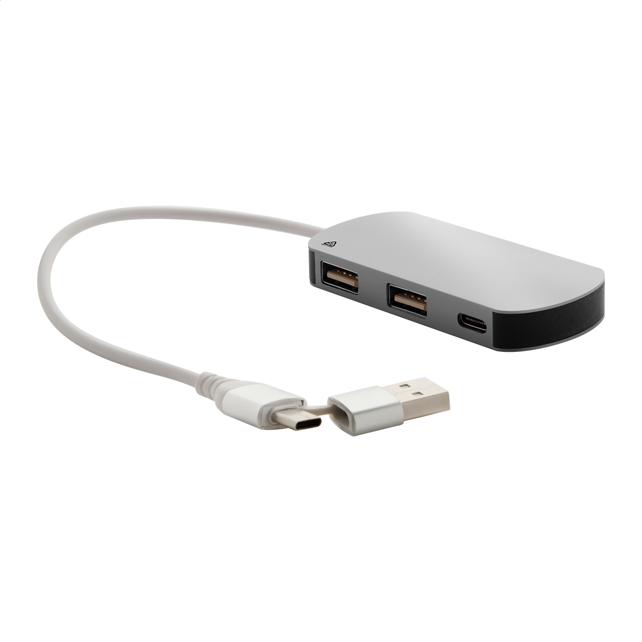 Hub USB in alluminio riciclato e ABS riciclato con 2 porte USB e 1 USB-C, USB 2.0. Fornito di cavo con connessioni USB e USB-C.