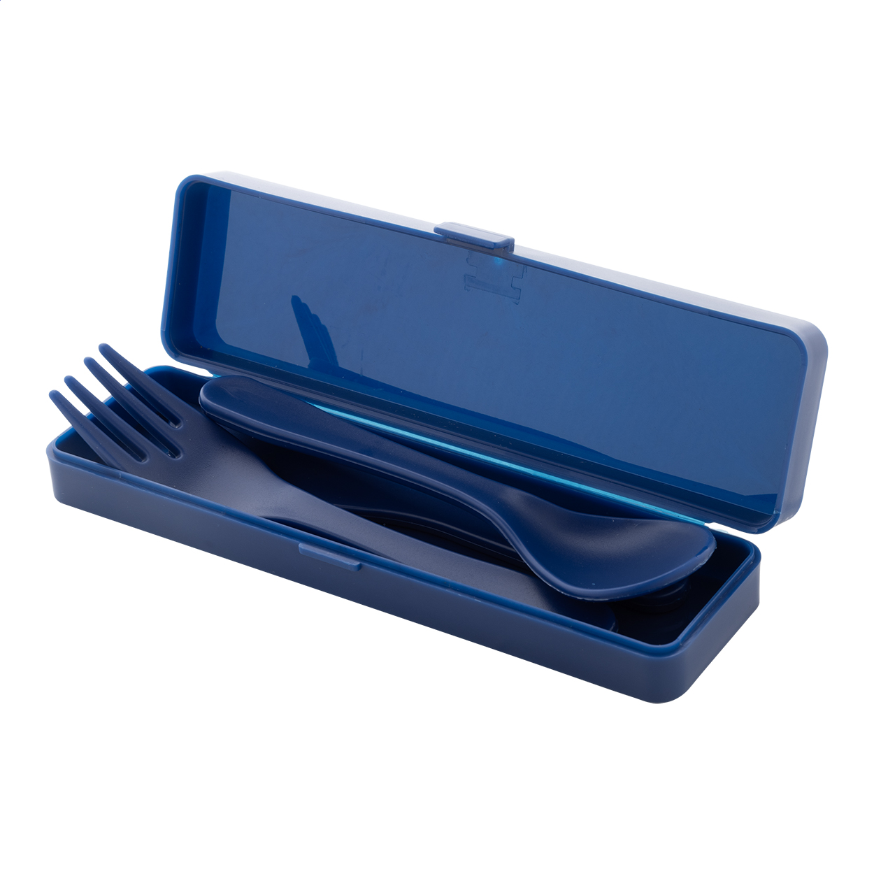Set composto da 3 posate in plastica PP con custodia in colore coordinato. Il set comprende una forchetta, un coltello e un cucchiaio.