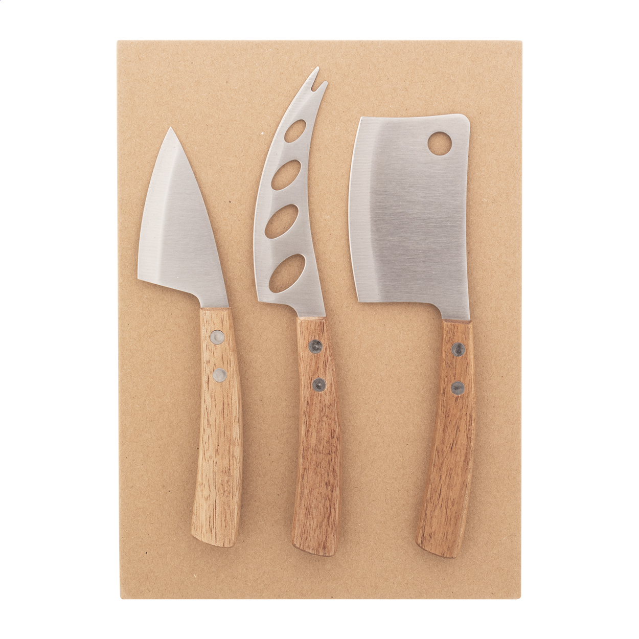 Set 3 coltelli da formaggio in acciaio inox con manici in legno di acacia. Confezione in scatola a forma di libro in cartoncino kraft.