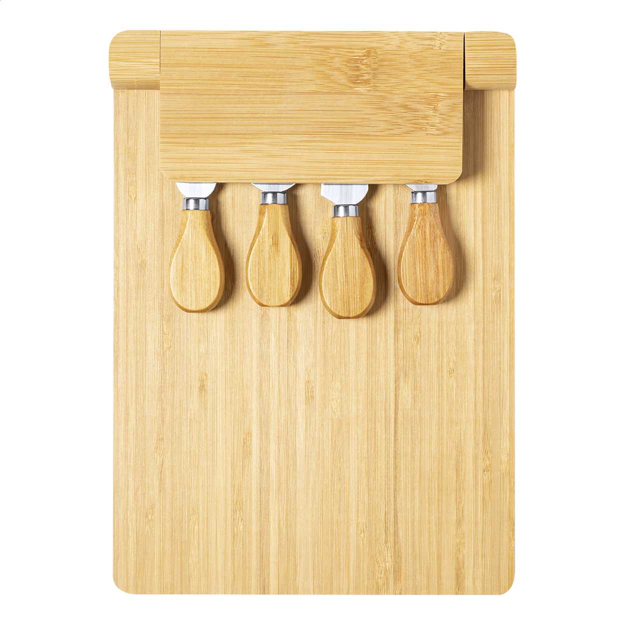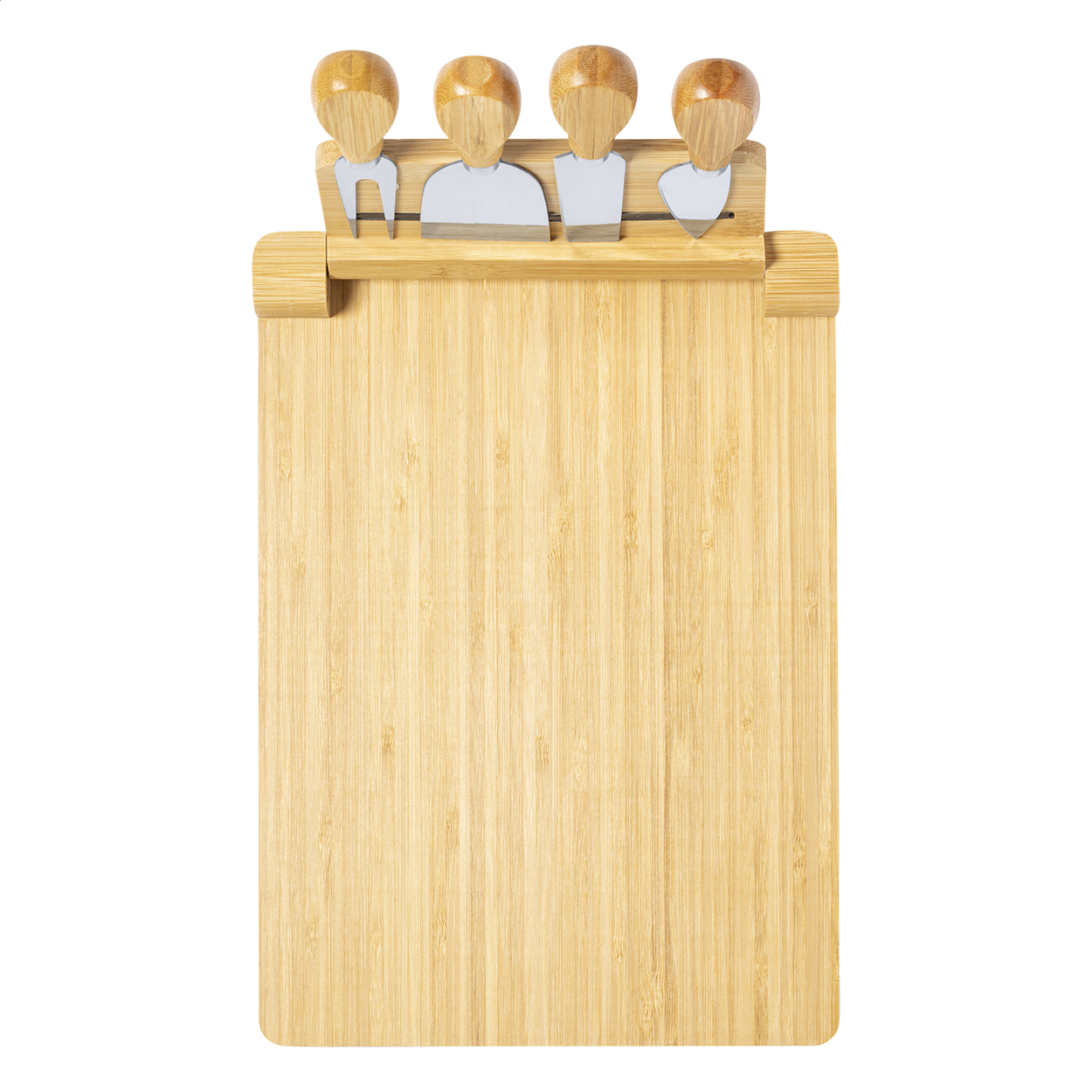 Tagliere in bambù con set di 4 coltelli da formaggio in acciaio inox su supporto magnetico pieghevole.