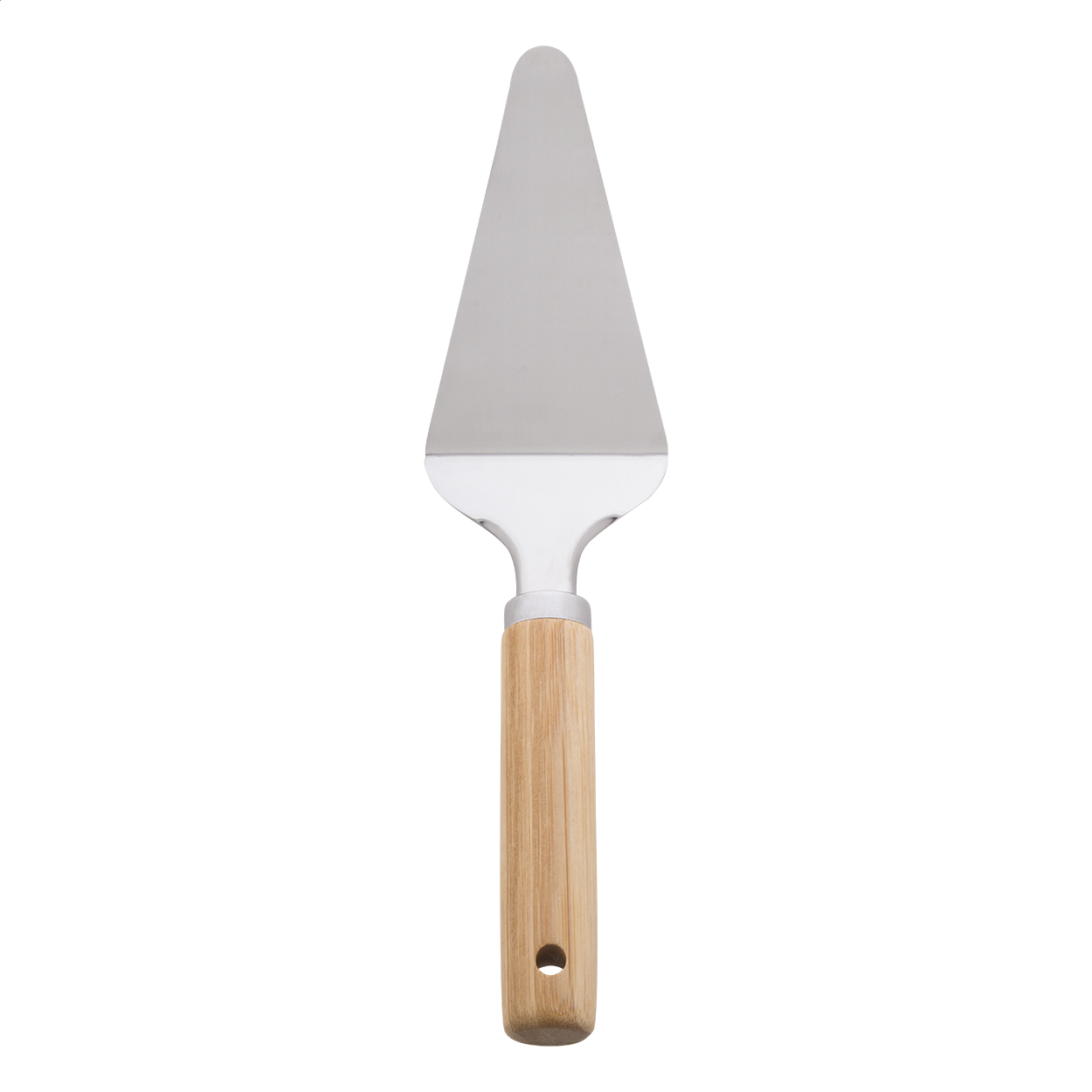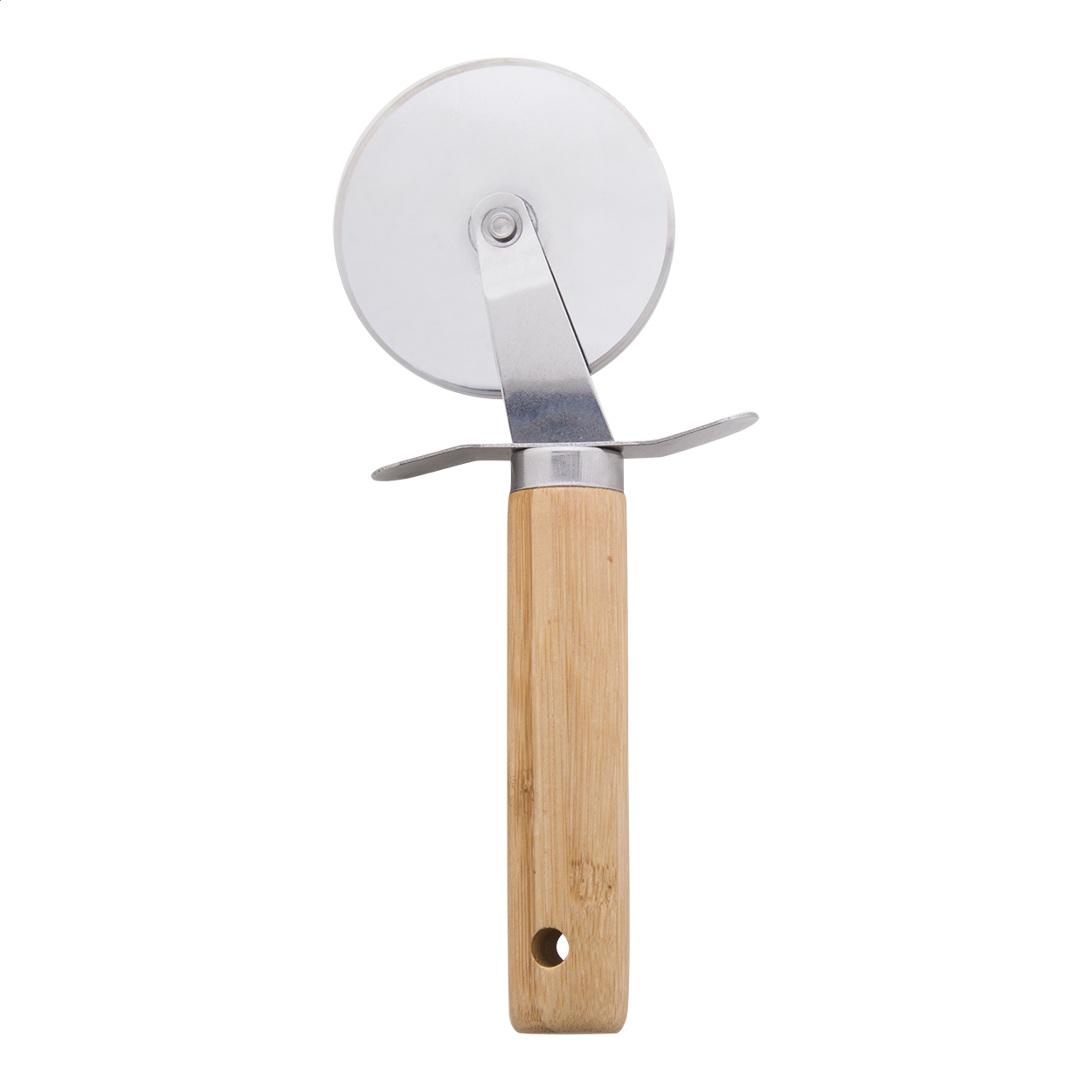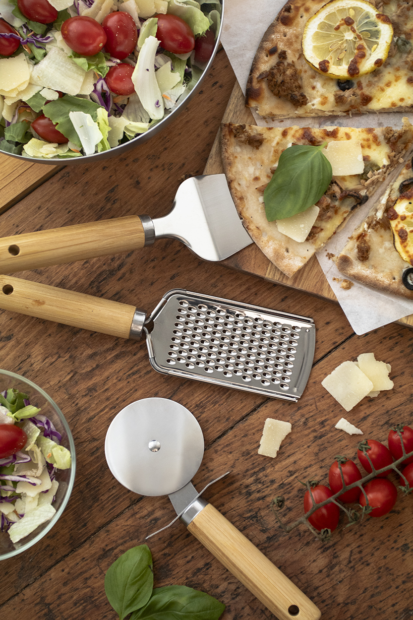 Set per servire la pizza in acciaio inossidabile da 3 pezzi con manico in bambù e comoda sacca in cotone con chiusura a coulisse. Il set è composto da una grattugia per formaggio, un taglia pizza ed una spatola.