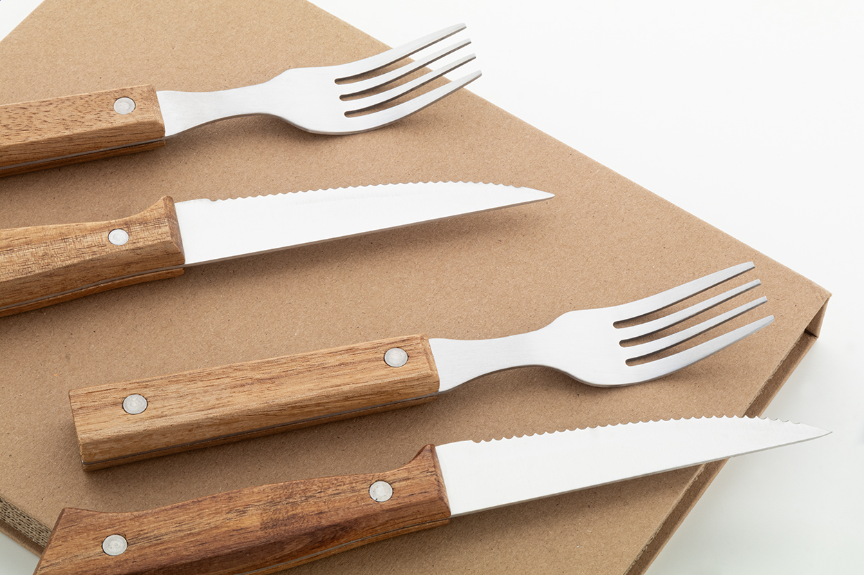 Set bistecca composto da 4 posate in acciaio inox con manico in legno di acacia (2 coltelli da bistecca, 2 forchette). Confezione a forma di libro in cartoncino kraft.