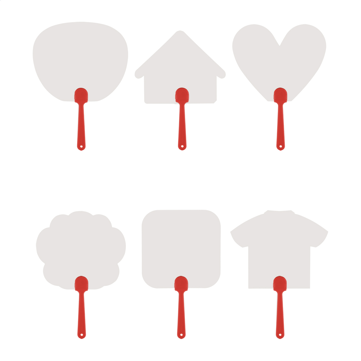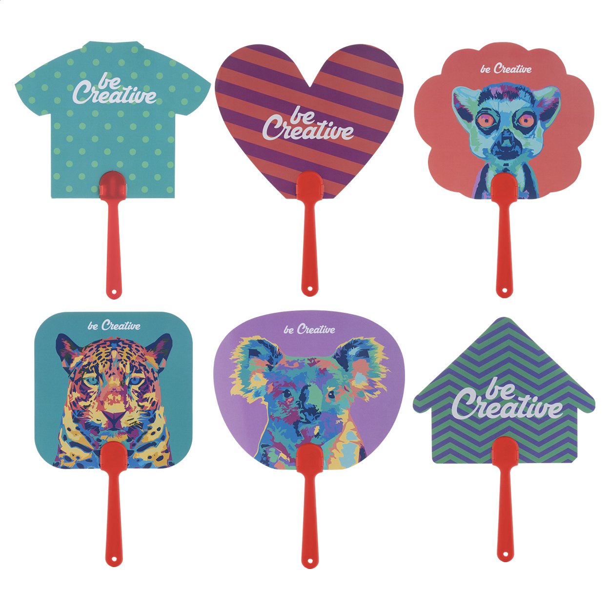 Ventaglio personalizzabile con manico in plastica e carta laminata. Stampa digitale con la tua grafica su entrambi i lati. MOQ: 100 pezzi.