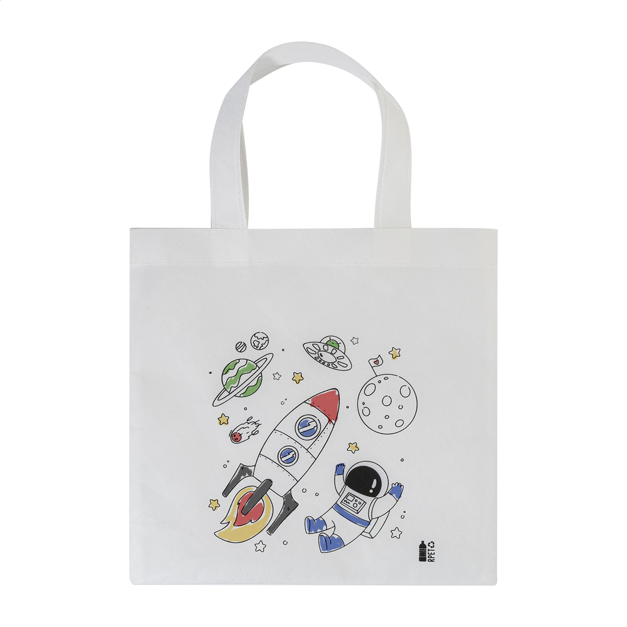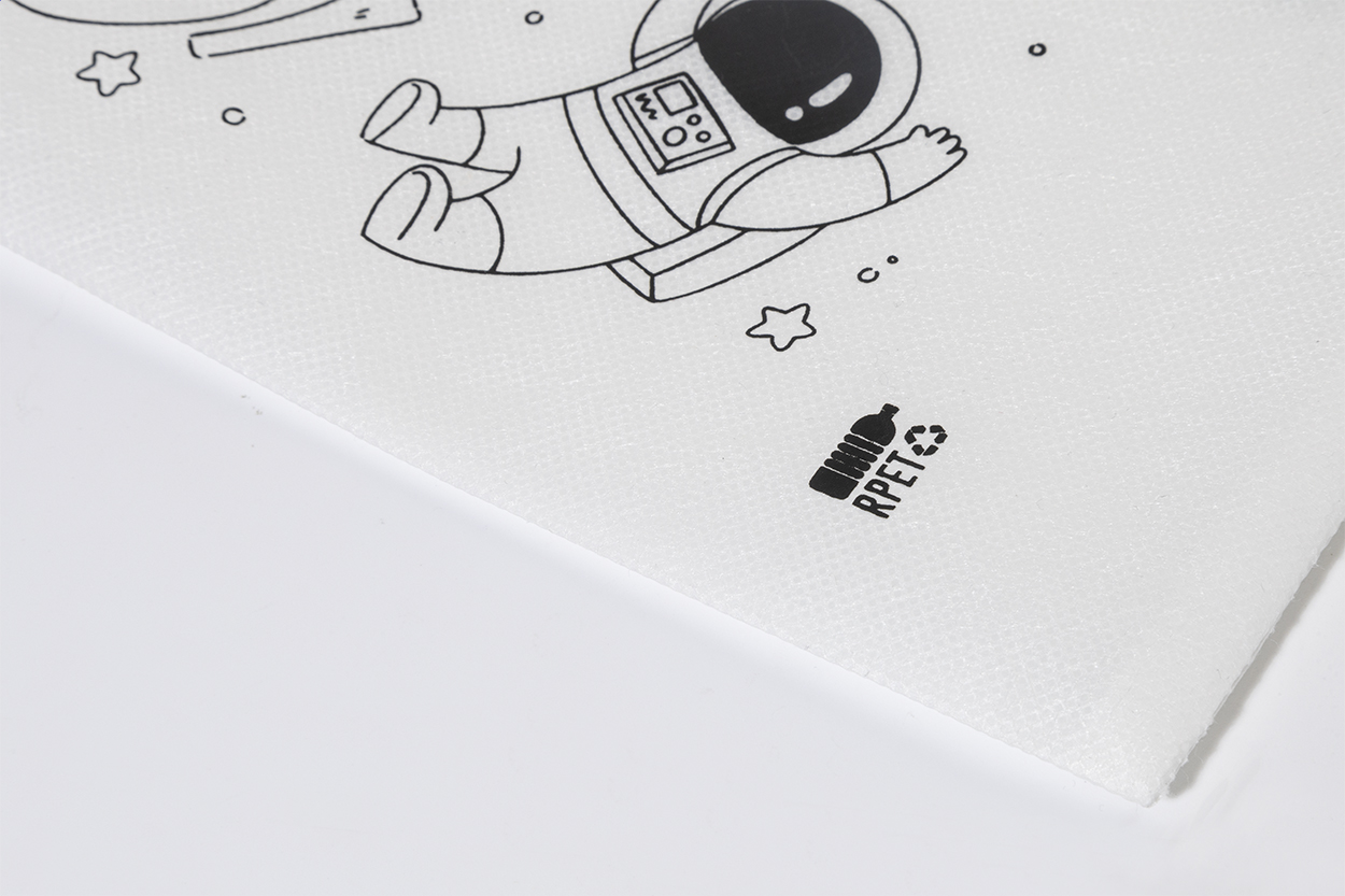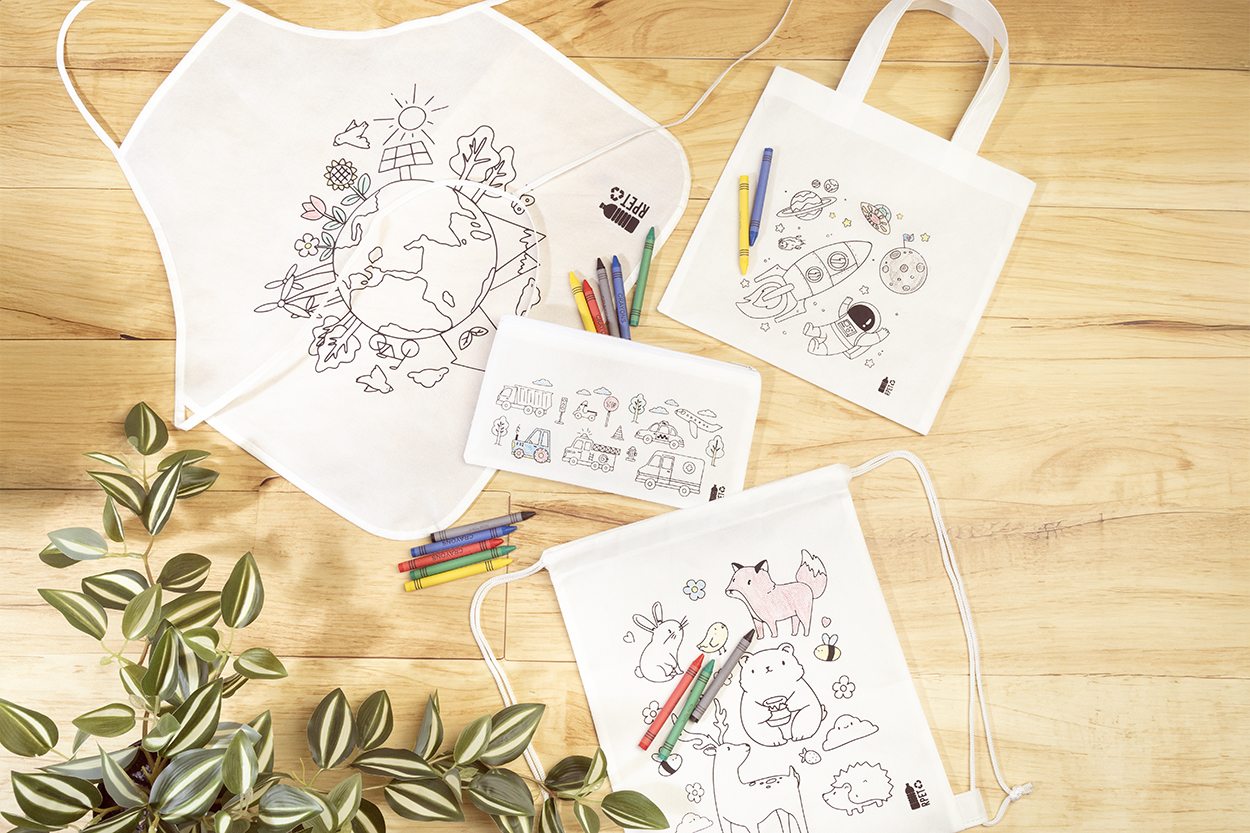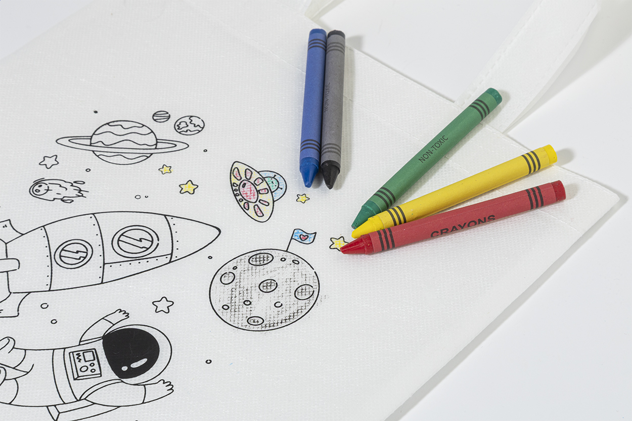 Mini borsa per la spesa in tessuto non tessuto RPET da decorare con 5 pastelli.