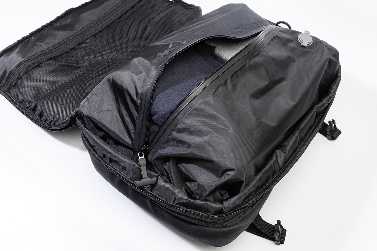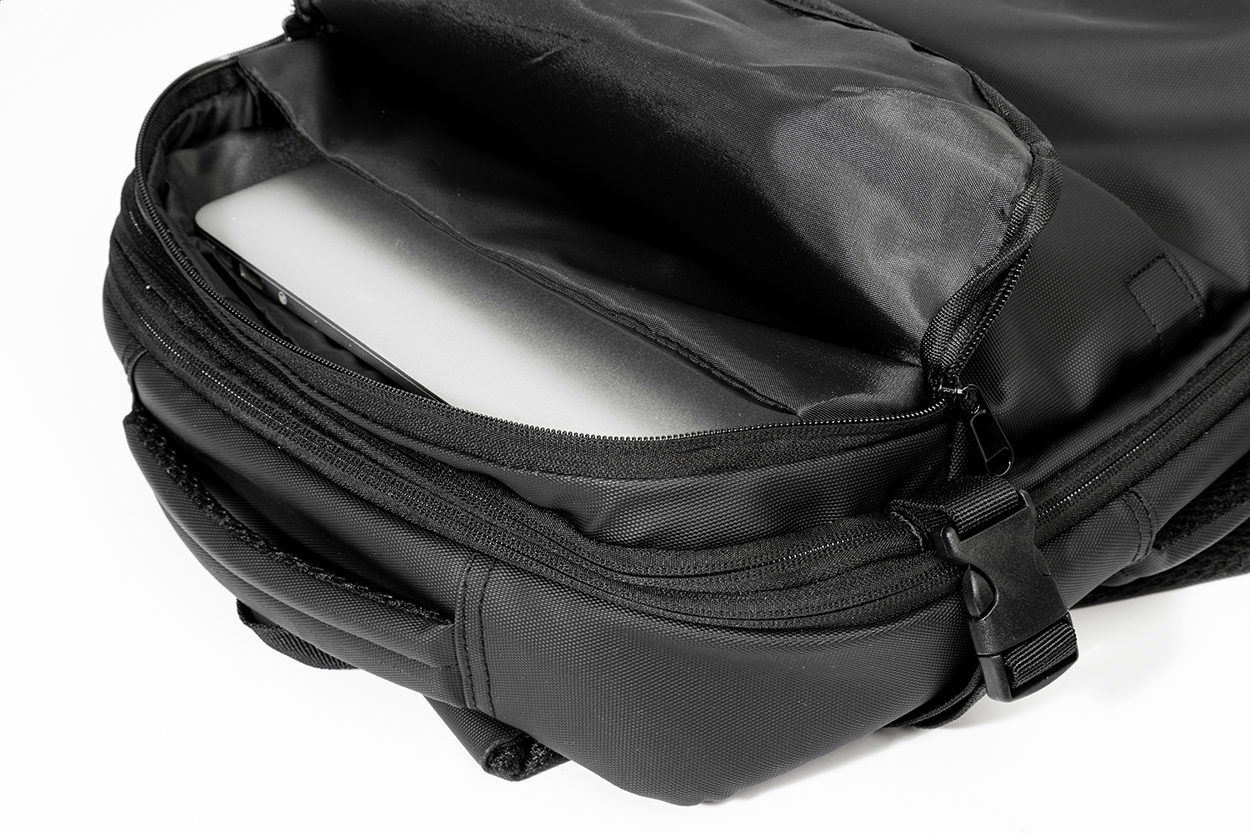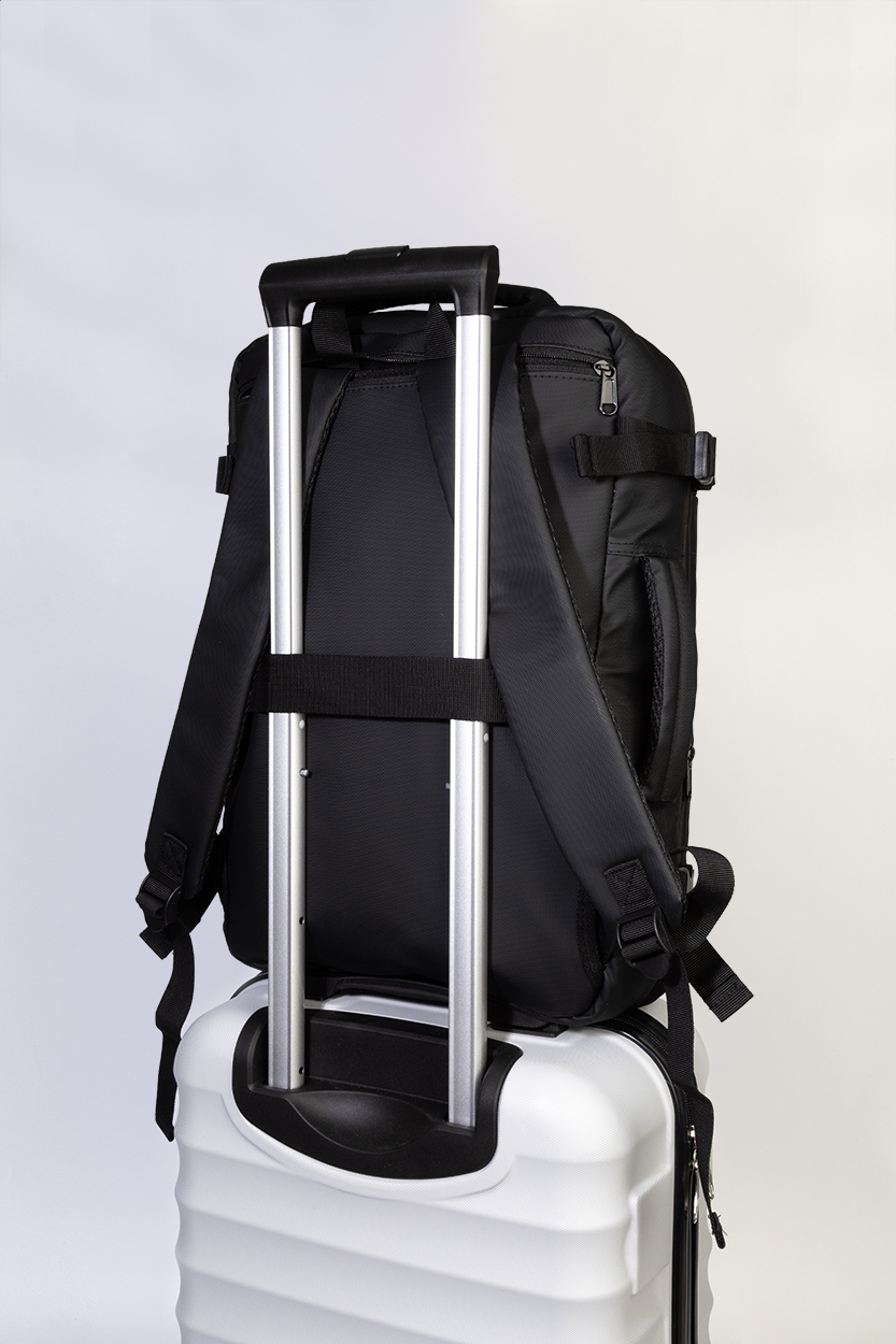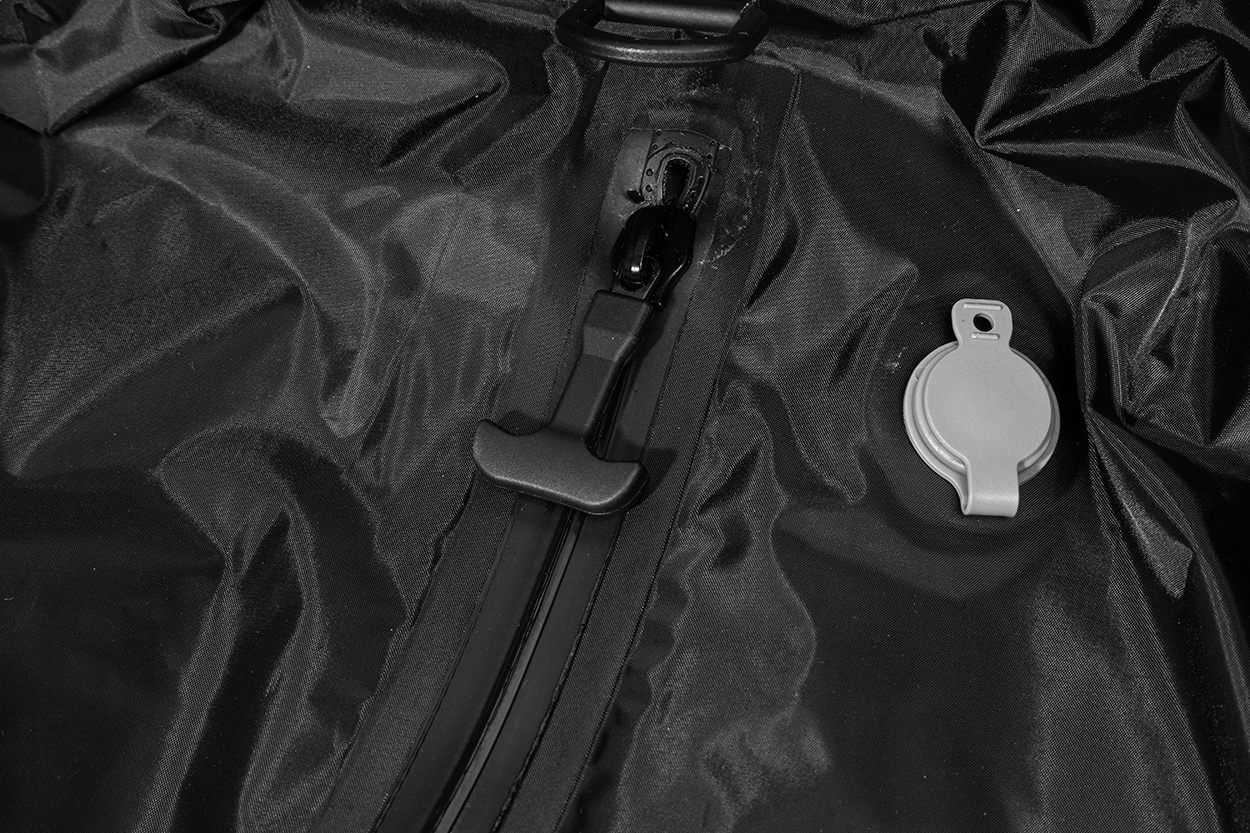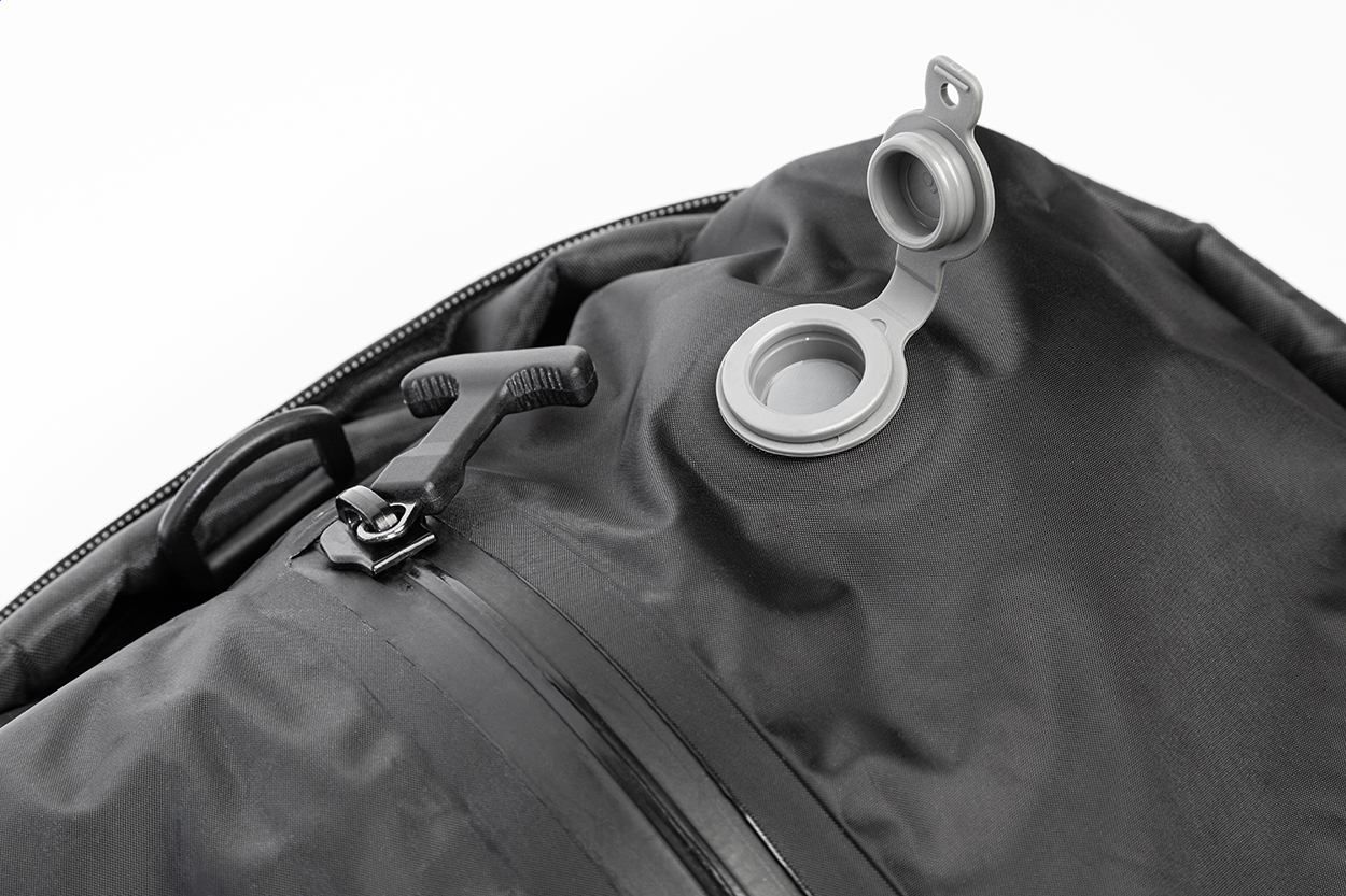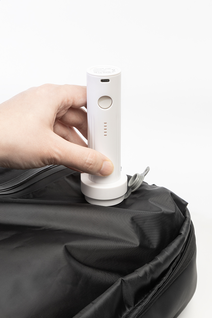 Zaino a compressione impermeabile ed estensibile con scomparti con cerniera, scomparto di compressione a vuoto incorporato, scomparto imbottito per laptop (15") e tasca frontale con cerniera. Con fibbie laterali, cinghia per trolley, schienale e spallacci imbottiti. Poliestere 600D rivestito in PU. Inclusa pompa per il vuoto con batteria ricaricabile USB (1500 mAh).
