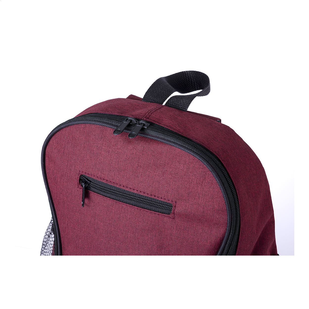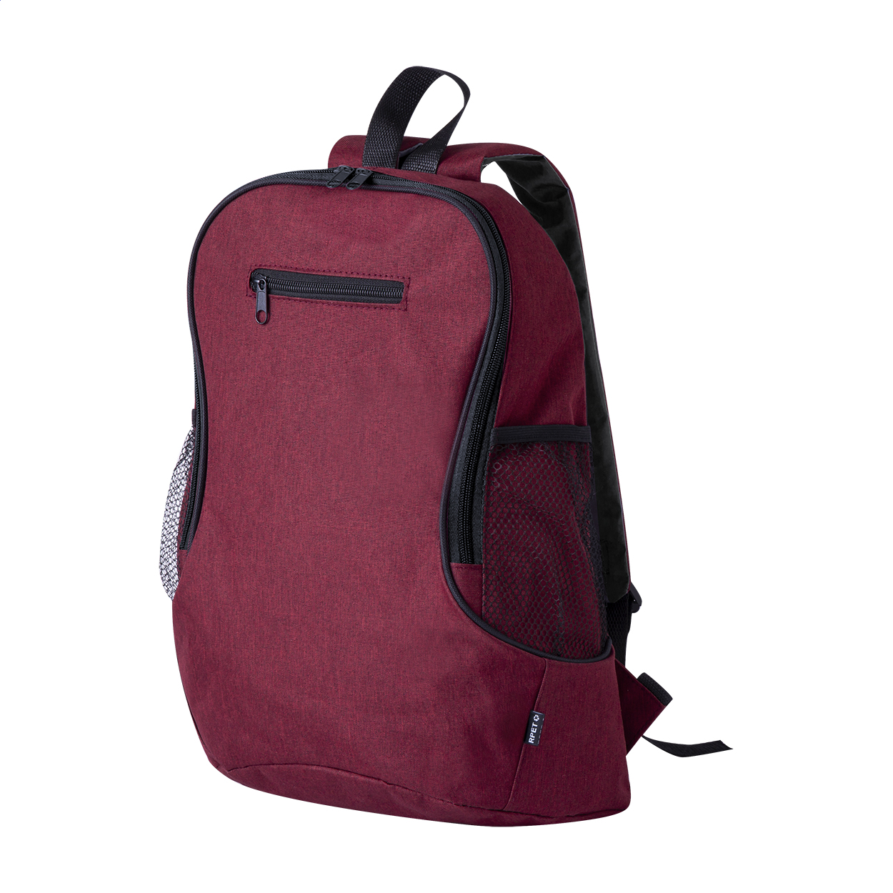 Zaino in poliestere 300D RPET con scomparto chiuso da cerniera, tasca frontale, tasche laterali in rete, schienale e spallacci imbottiti ed etichetta RPET.