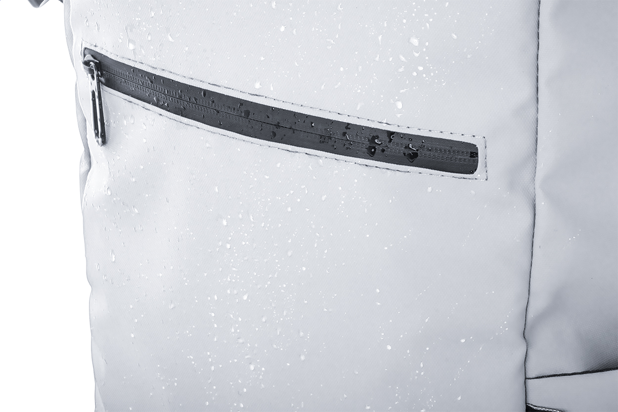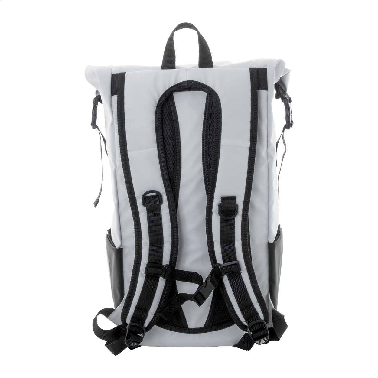 Zaino impermeabile in poliestere 600D RPET spalmato in PU, con chiusura avvolgibile completa di fibbia e velcro, scomparto imbottito per laptop (16") e tablet (10"), tasca frontale con cerniera, tasche laterali, schienale e spallacci imbottiti ed etichetta RPET.