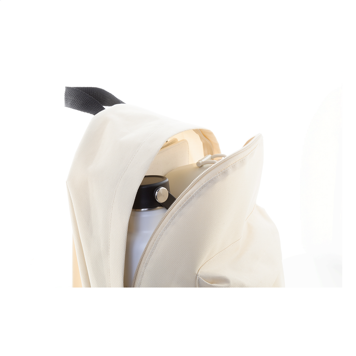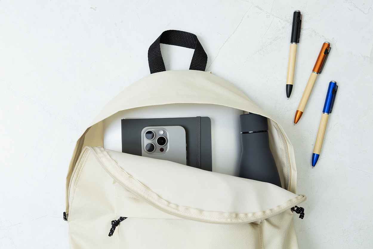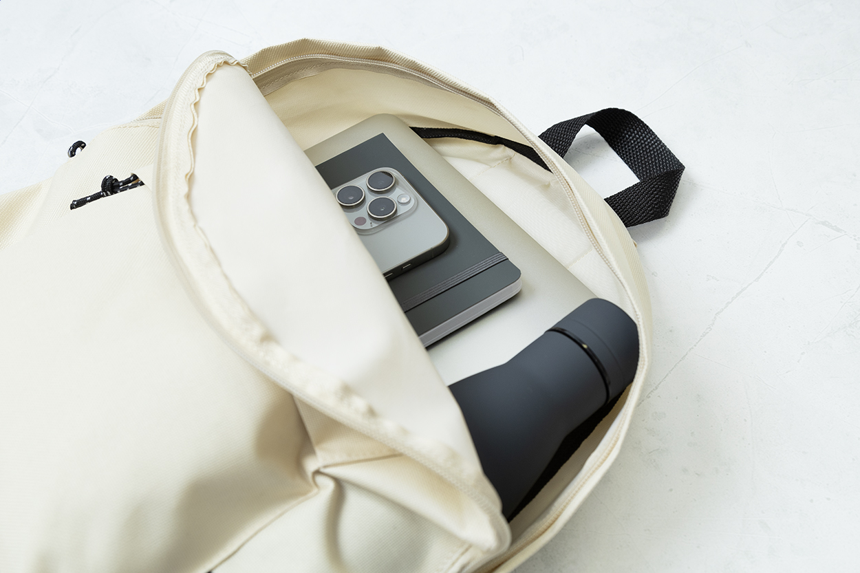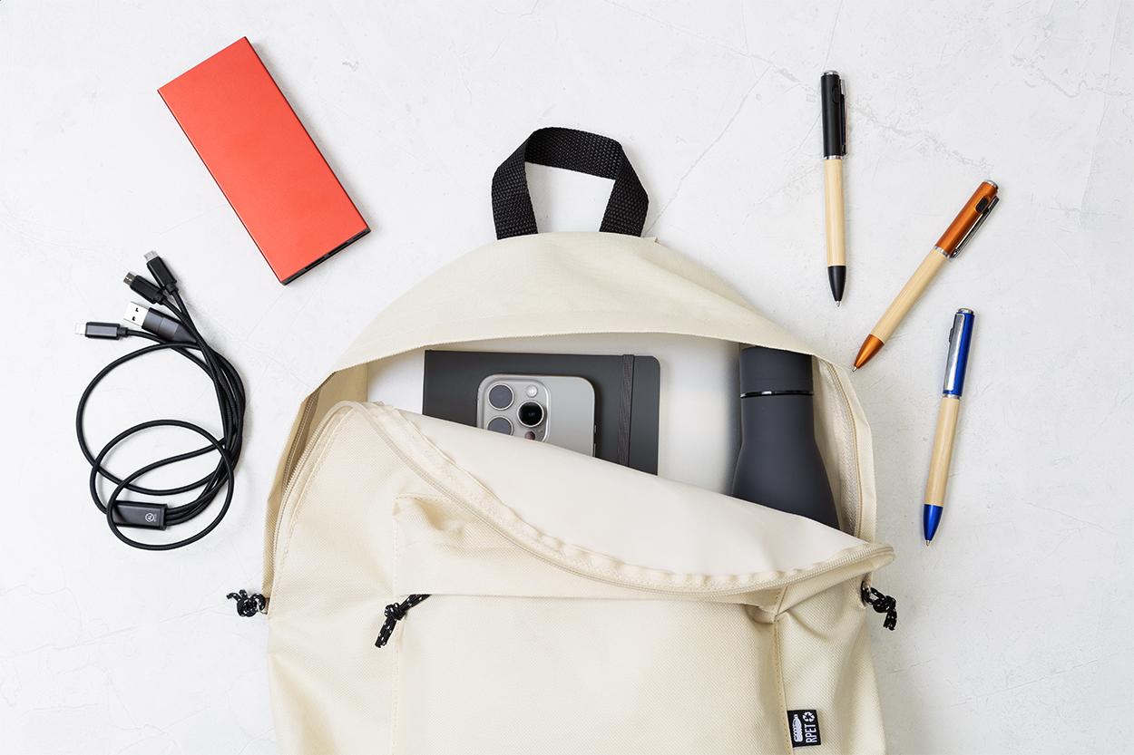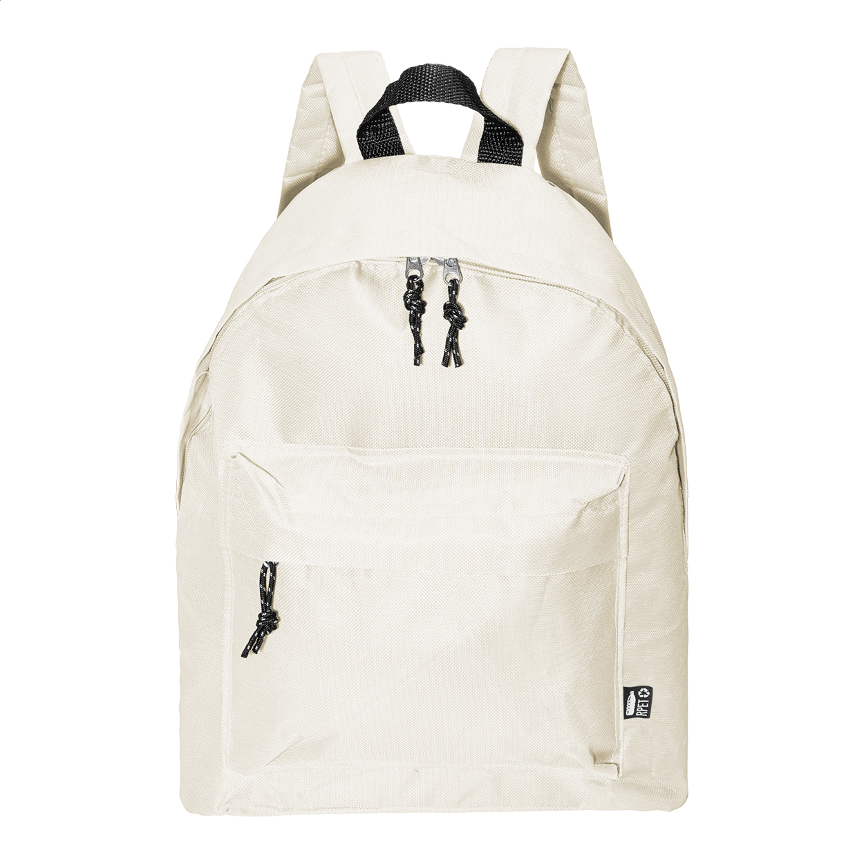 Zaino in poliestere 600D RPET con scomparto principale e tasca frontale chiusi da cerniera, schienale e spallacci imbottiti ed etichetta RPET.