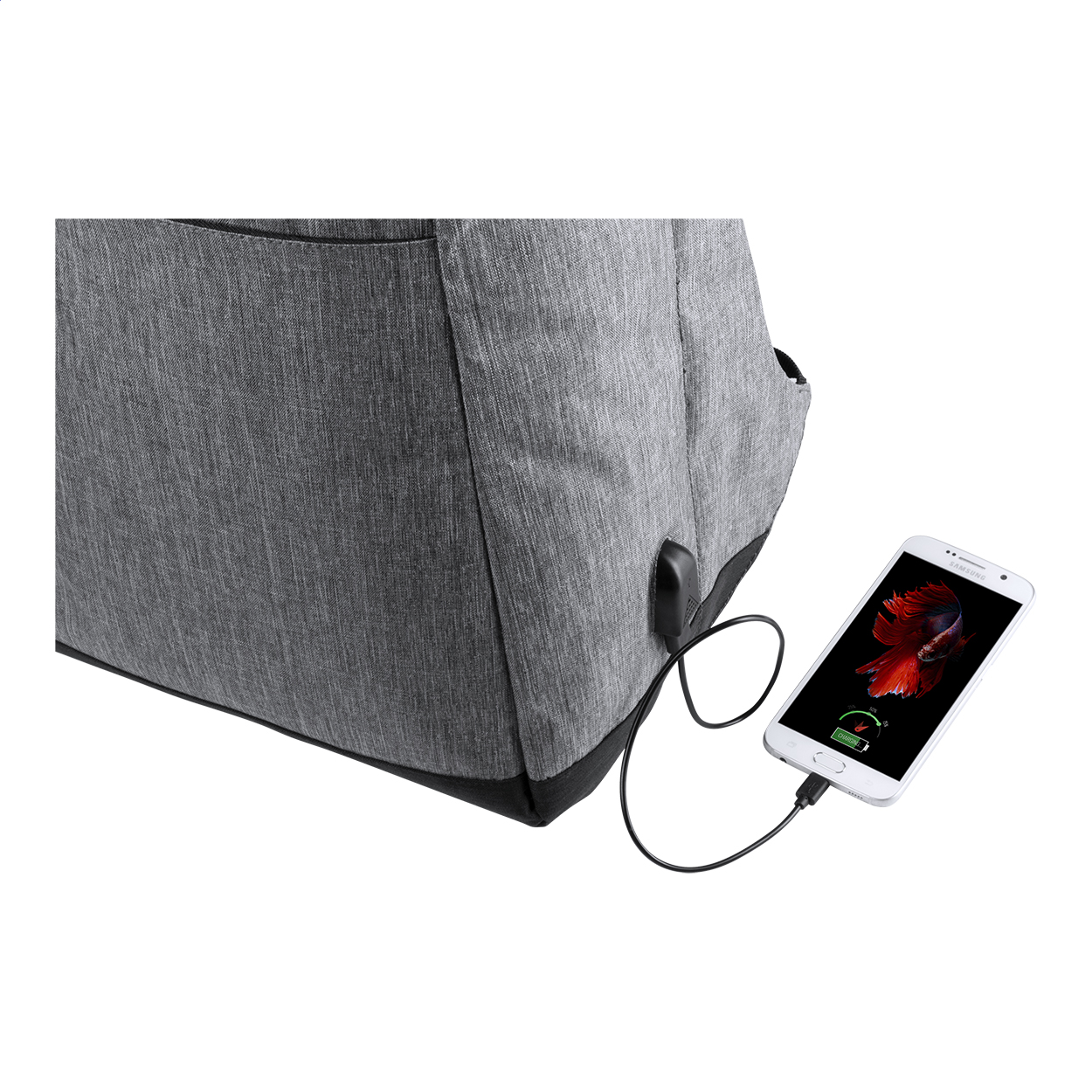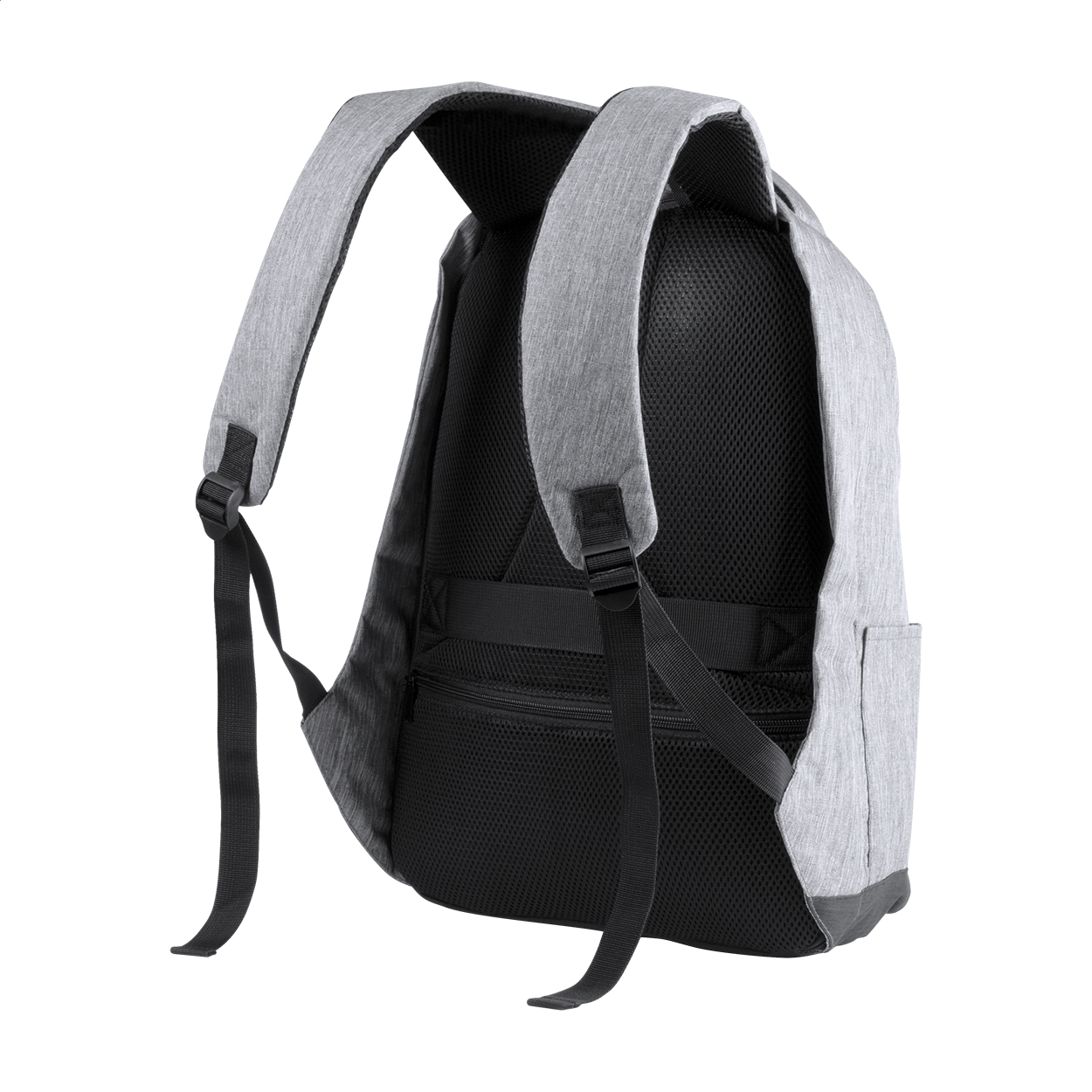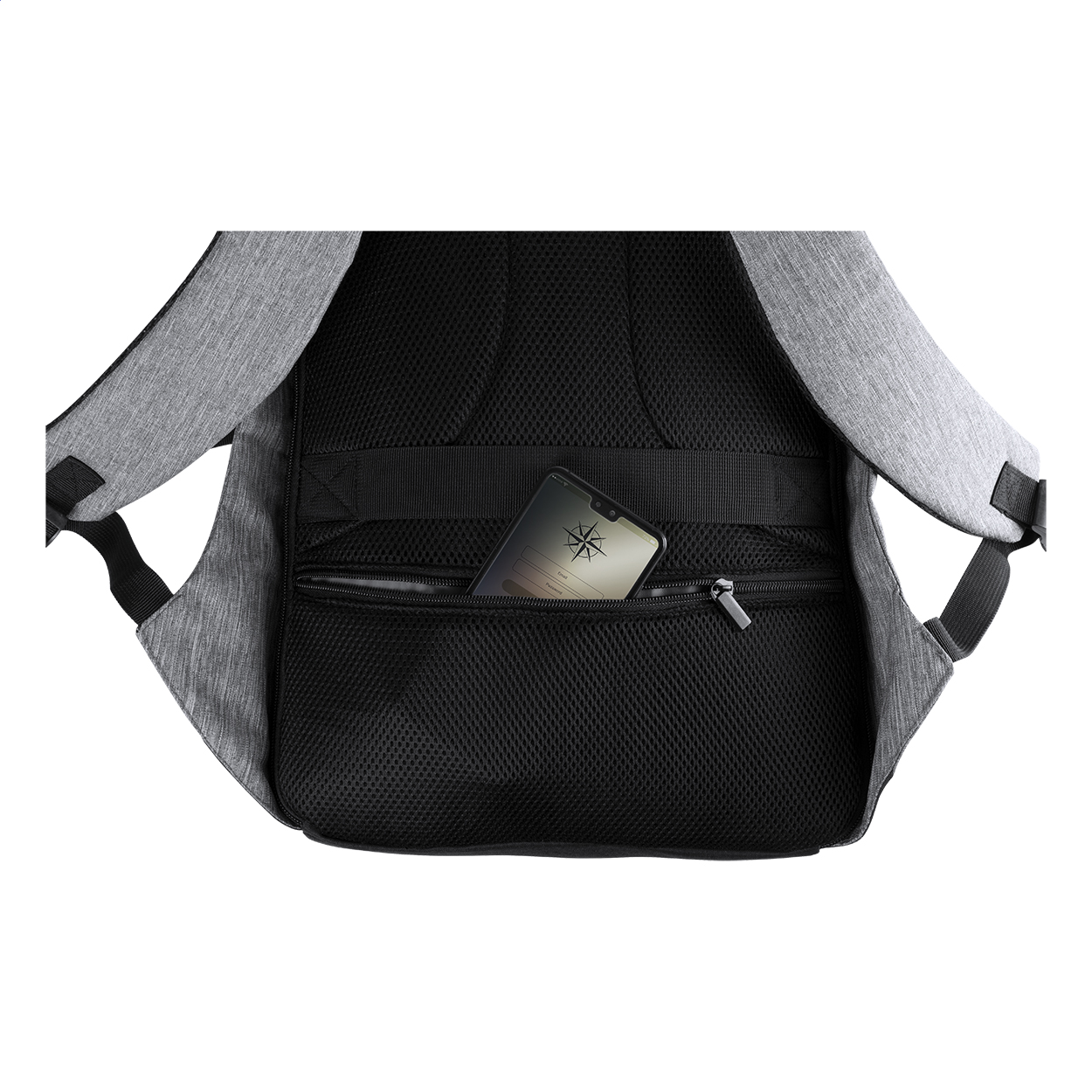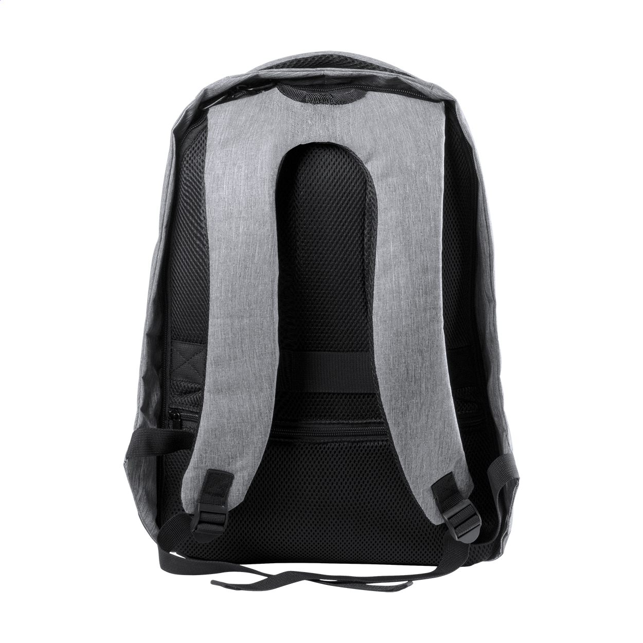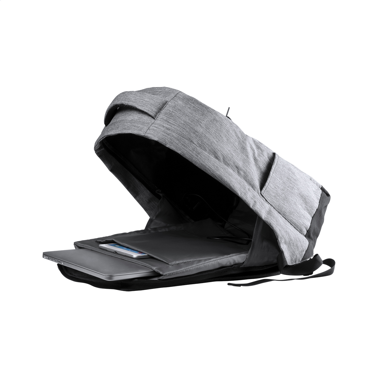 Zaino antitaccheggio con tasche multiple, scomparto imbottito per laptop (15") e tablet (12"), schienale imbottito e tracolla. Con cinghia trolley e connessione USB integrata per power bank. 600D Poliestere.