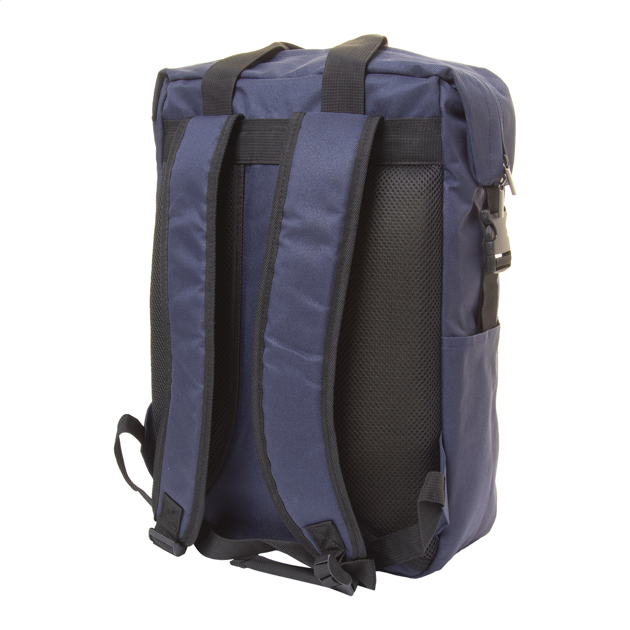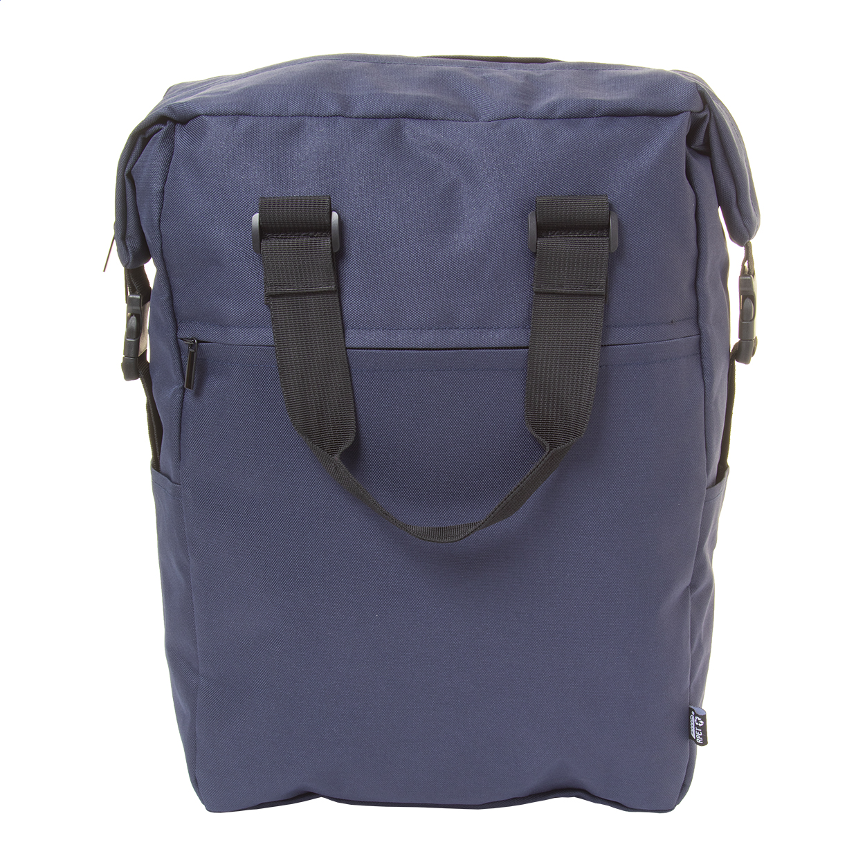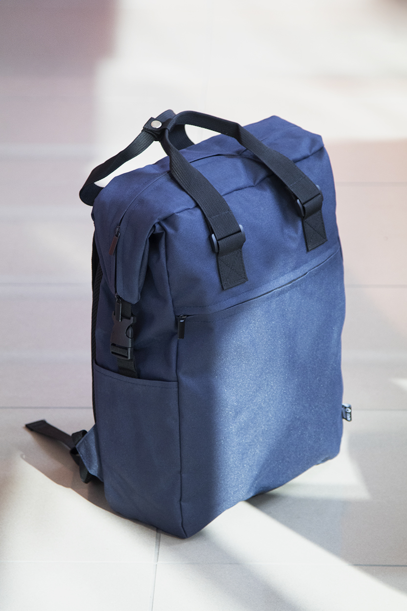 Zaino in RPET con scomparto principale e tasca frontale con zip, scomparto imbottito per laptop (15") e tablet (10"), cinghie laterali con fibbia e tasche, schienale e spallacci imbottiti. Poliestere 600D RPET con etichetta RPET.