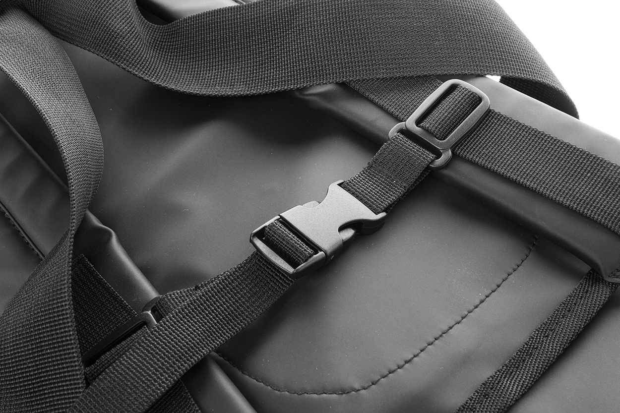 Borsa sportiva in morbida pelle PU riciclata, impermeabile e utilizzabile anche come zaino, con scomparto principale chiuso da cerniera, schienale, spallacci imbottiti edetichetta PU riciclato.