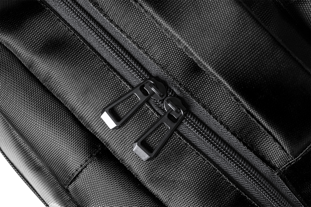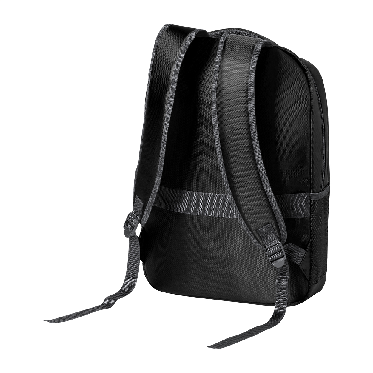 Zaino RNYLON con scomparti chiusi da cerniera, tasche laterali in rete, tasca imbottita per laptop (15"), cinghia trolley, schienale e spallacci imbottiti. In nylon riciclato 420D ed etichetta RNYLON.