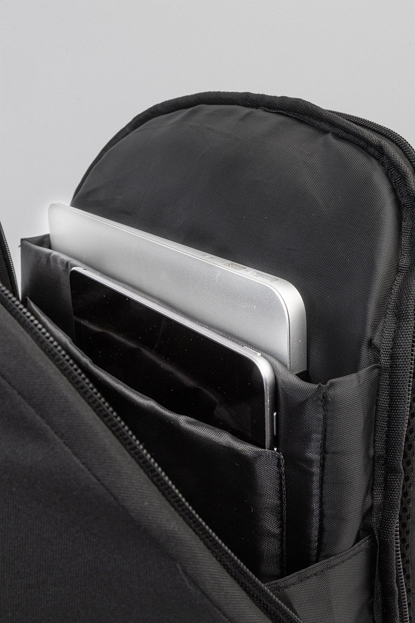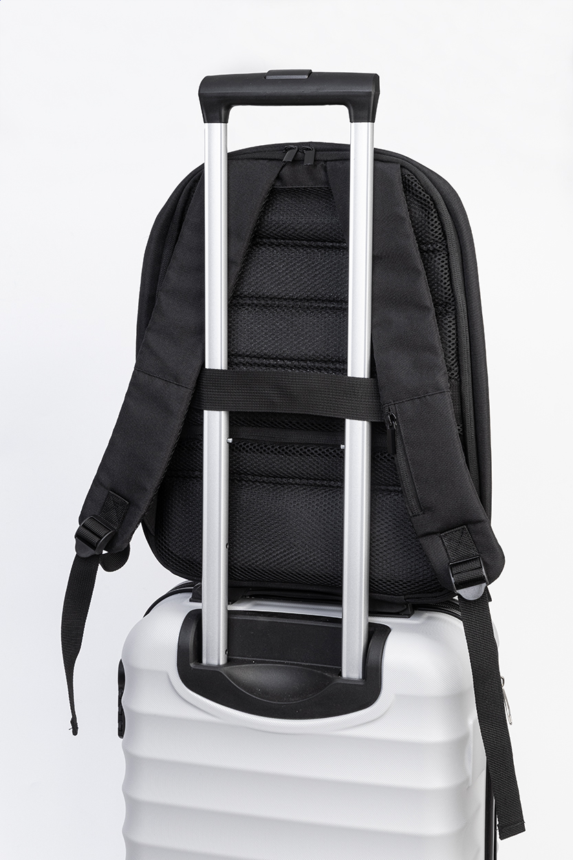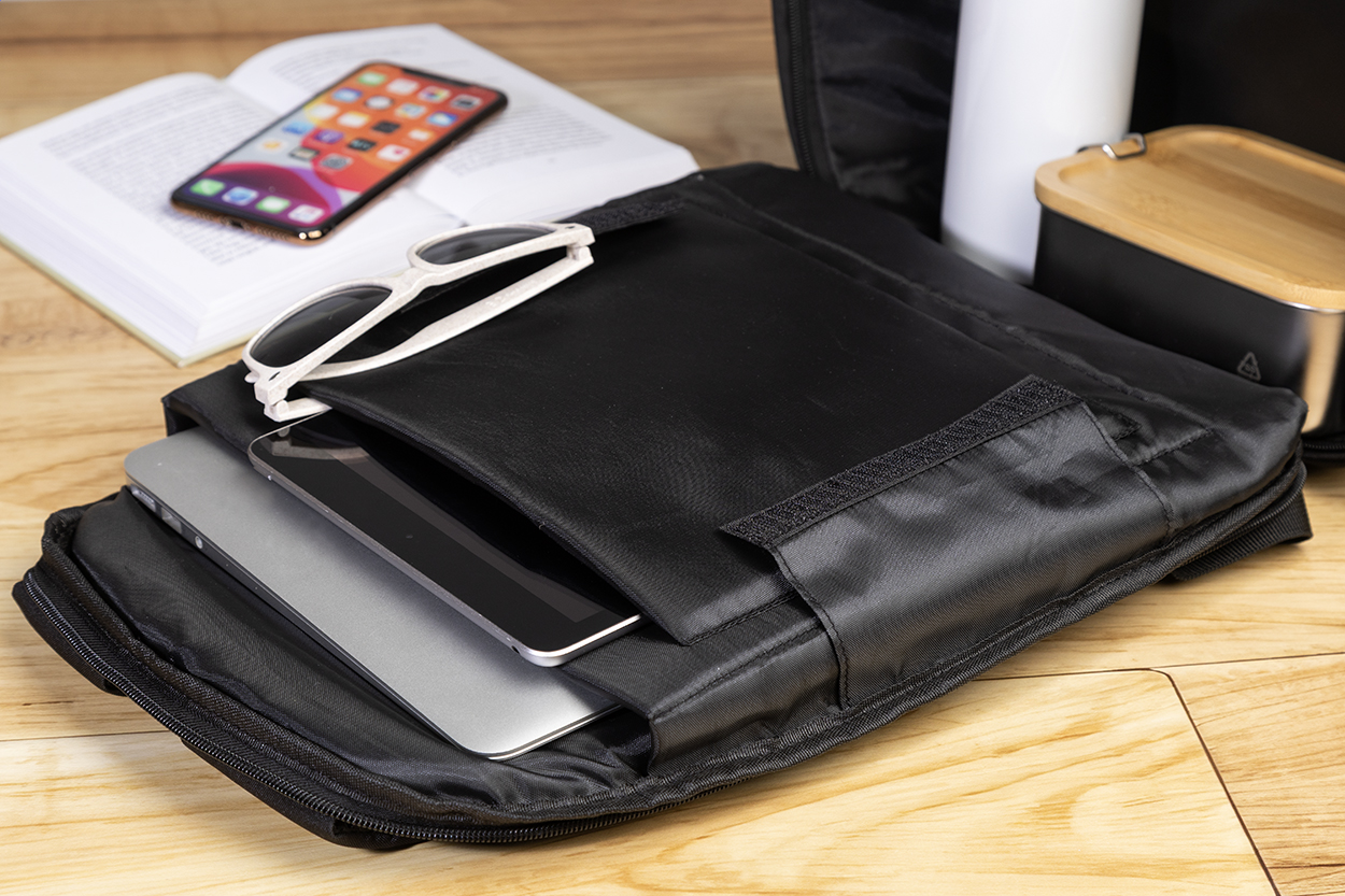 Zaino antitaccheggio in poliestere 300D RPET con tasca chiusa da cerniera, scomparto imbottito per laptop (15“) e tablet (12”), cinghia per trolley, schienale e spallacci imbottiti. Con tasca antitaccheggio nascosta ed etichetta RPET.